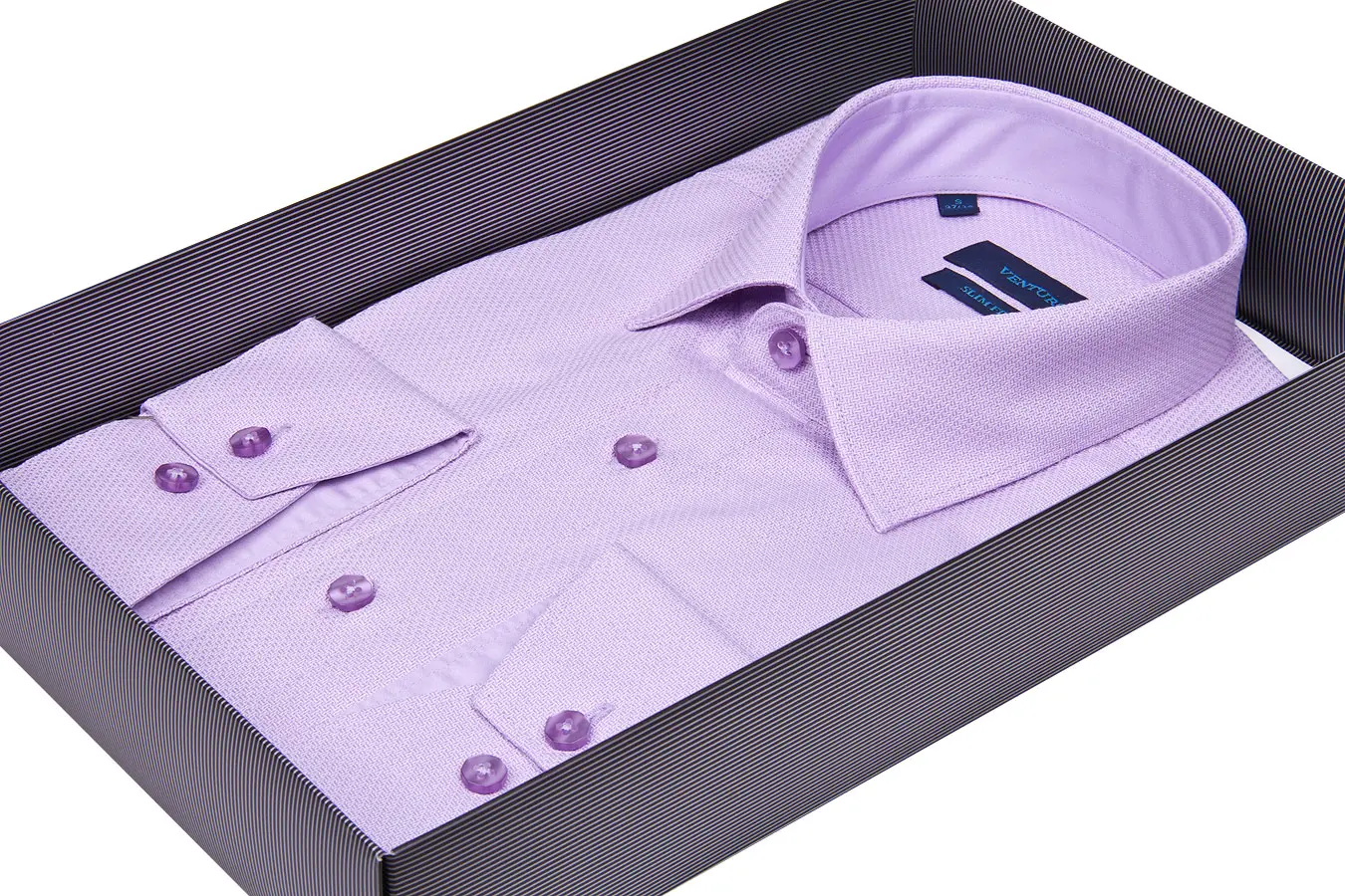 Стильная сиреневая приталенная мужская рубашка с длинным рукавом популярного итальянского производителя Venturo. Состав ткани 100% хлопок. Ничего лишнего - классический воротник и зауженная талия. Идеальный вариант как для повседневного образа, так и для офисного стиля.