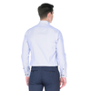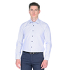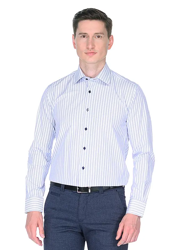 Яркая приталенная мужская рубашка Venturo 22024-01 белого цвета в синюю полоску с длинными рукавами и классическим воротником из натуральной хлопковой ткани с добавлением полиэтера.