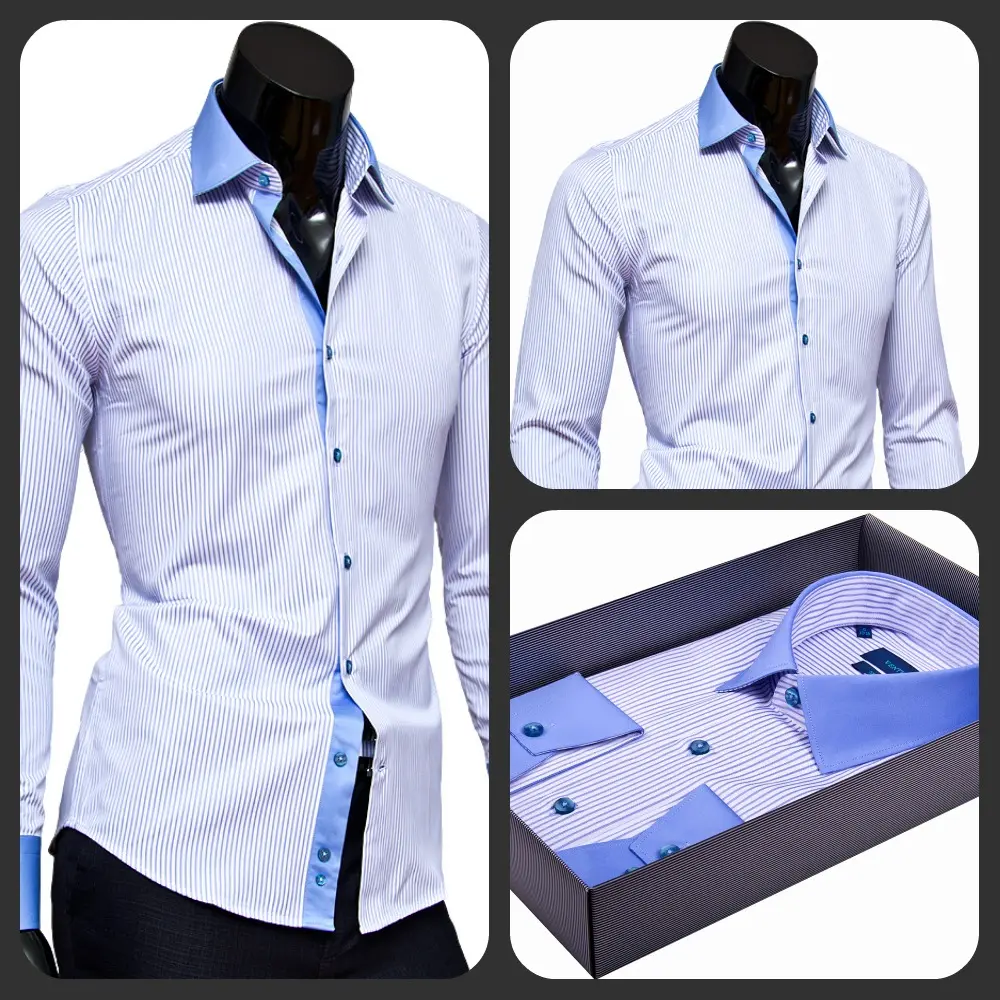 Стильная белая мужская рубашка в полоску с голубыми комбинированными манжетами и воротником