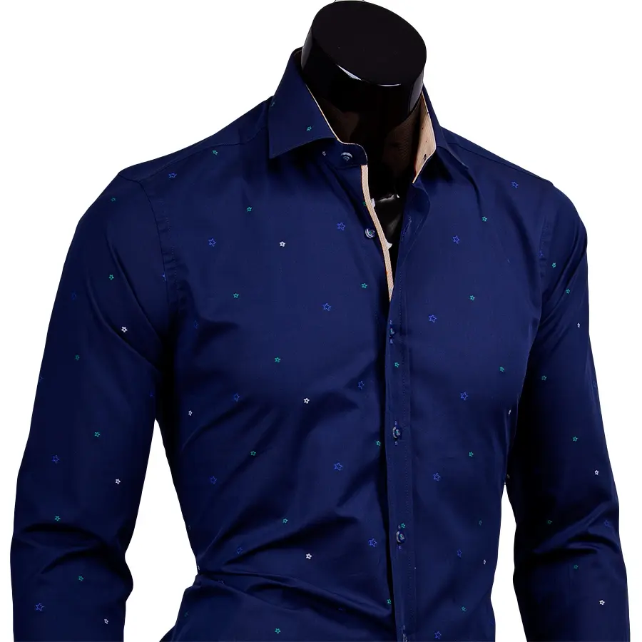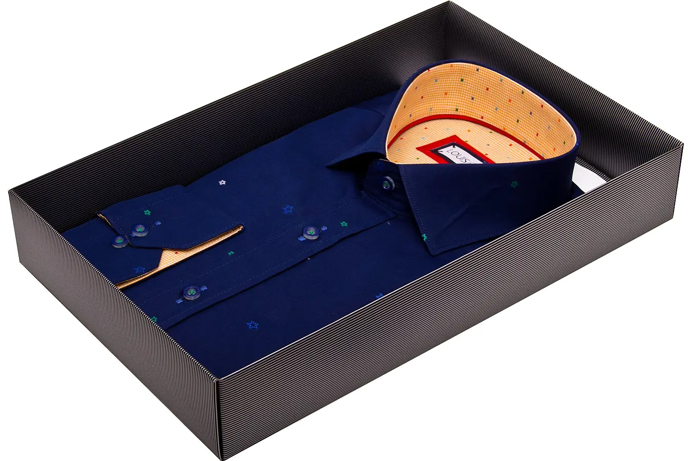 Стильная молодежная рубашка темно-синего цвета с необычным рисунком в виде звезд и контрастной планкой – отличный выбор для энергичного молодого человека, который следит за модой.