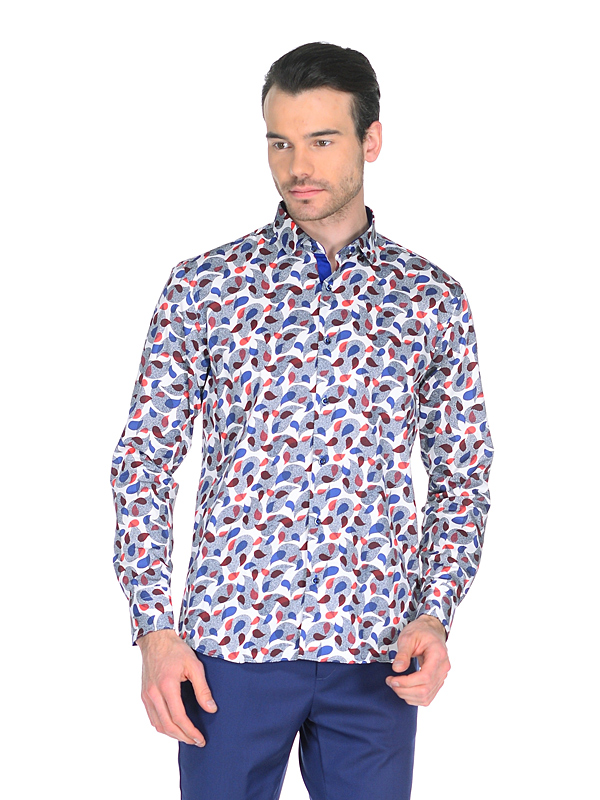 Яркая приталенная мужская рубашка Rvvaldi в синих и красных листьях с длинными рукавами и классическим воротником из натуральной 100% хлопковой ткани.