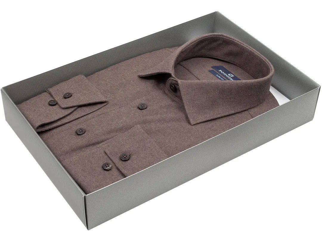 Зимняя приталенная мужская рубашка Poggino 5007-08 коричневого цвета с длинным рукавом и классическим воротником из натуральной байковой 100% хлопковой ткани.