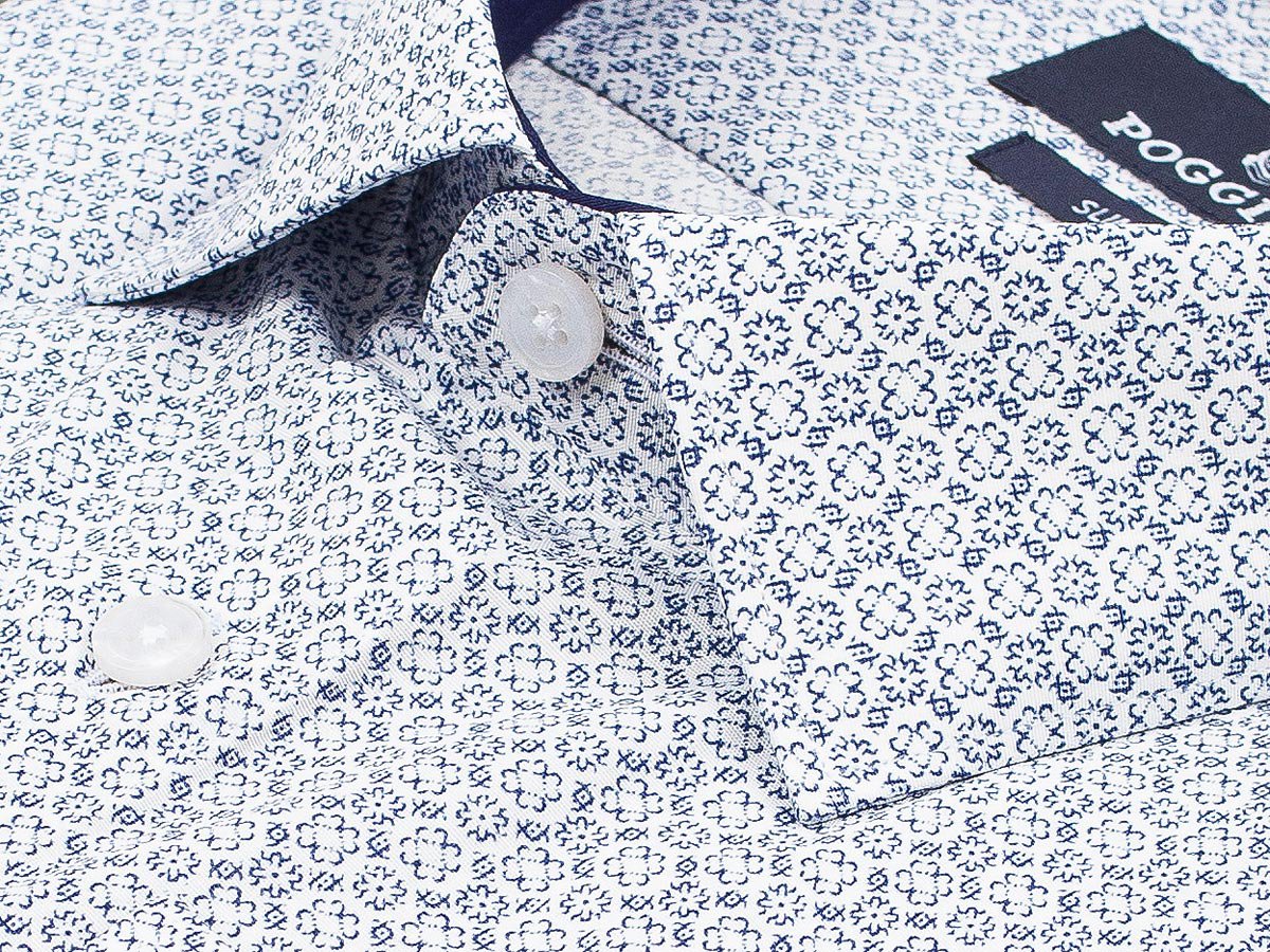 Стильная приталенная мужская рубашка Poggino 1000-09 бело-синего цвета в цветочек с длинными рукавами и классическим воротником из натуральной 100% хлопковой ткани.