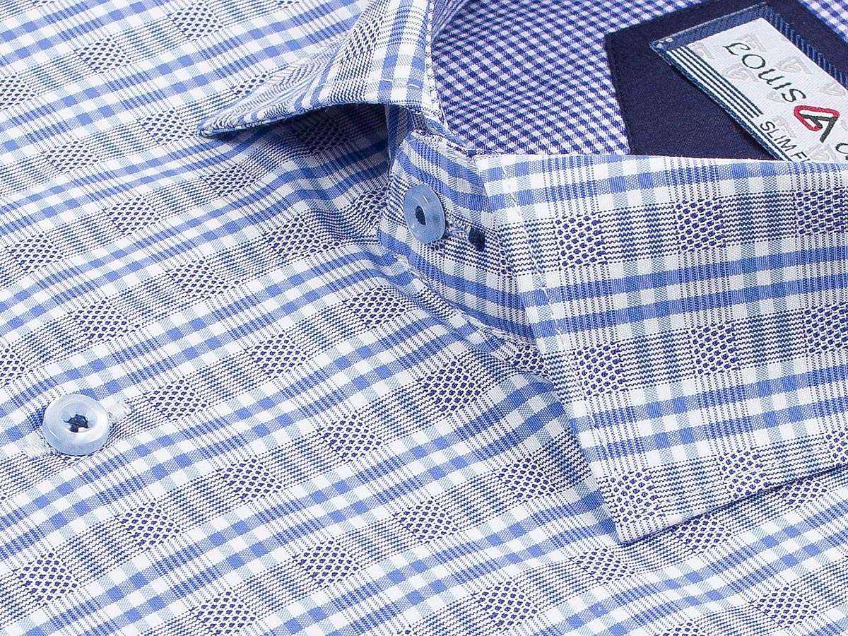 Приталенная мужская рубашка Louis Amava 1116-266 синего цвета в клетку с коротким рукавом и классическим воротником из натуральной хлопковой ткани с добавлением полиэстера.