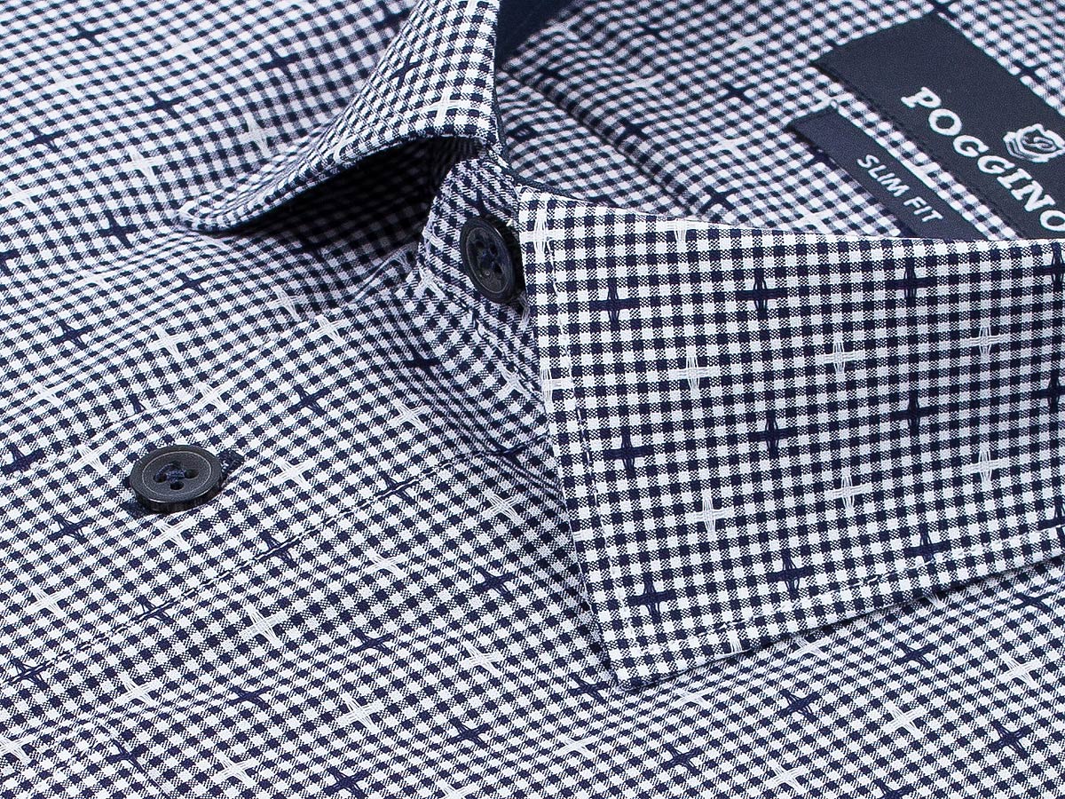 Приталенная мужская рубашка Poggino 5009-14 темно-синего цвета в клетку с длинными рукавами и классическим воротником из натуральной 100% хлопковой ткани.