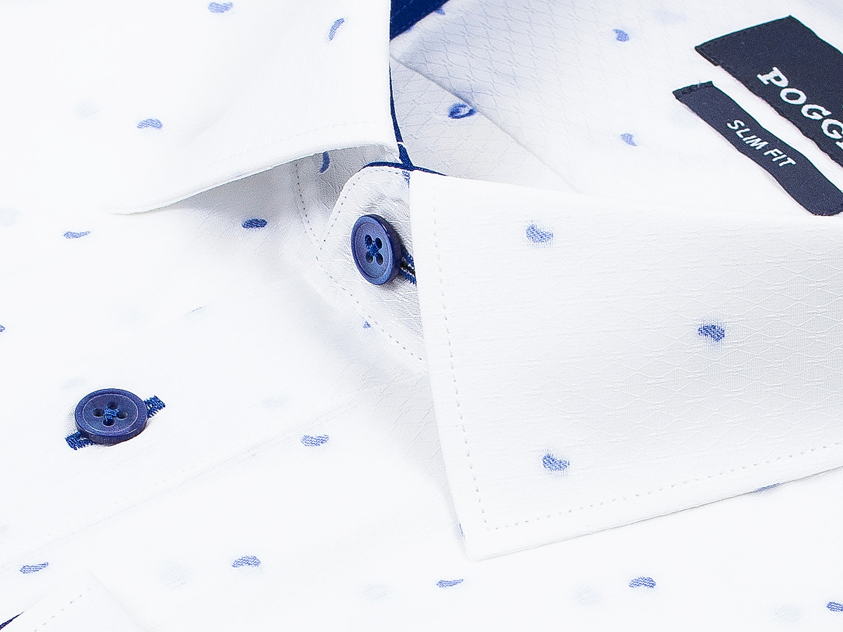 Приталенная мужская рубашка Poggino 5007-51 белого цвета в мелкий огурчик с длинными рукавами и классическим воротником из натуральной текстурной 100% хлопковой ткани.