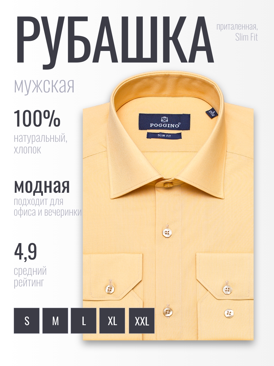Приталенная мужская рубашка Poggino 3300-03 мокасинового цвета с длинными рукавами и классическим воротником из натуральной 100% хлопковой ткани.
