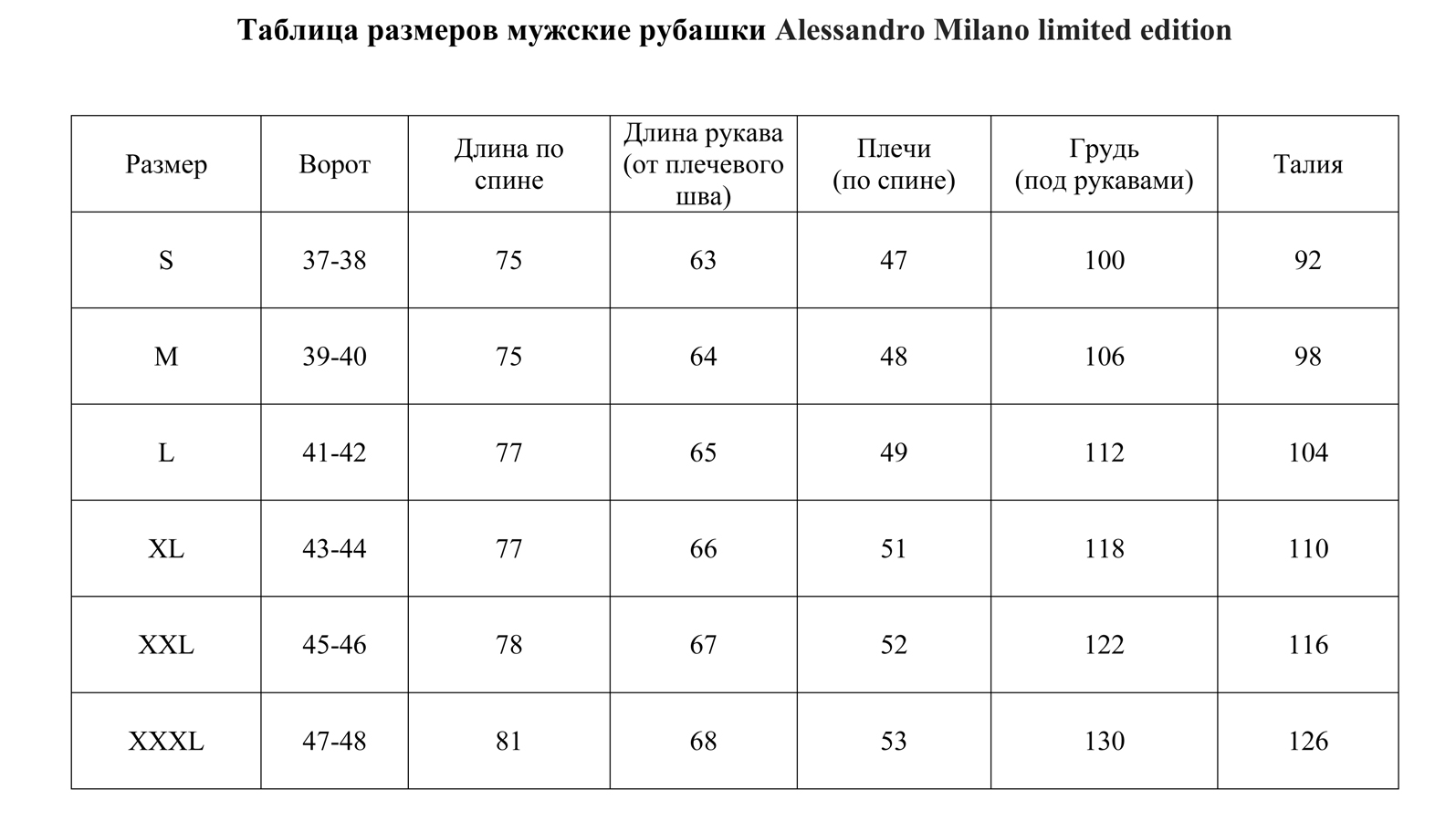 Таблица размеров мужские рубашки Alessandro Milano Limited Edition
