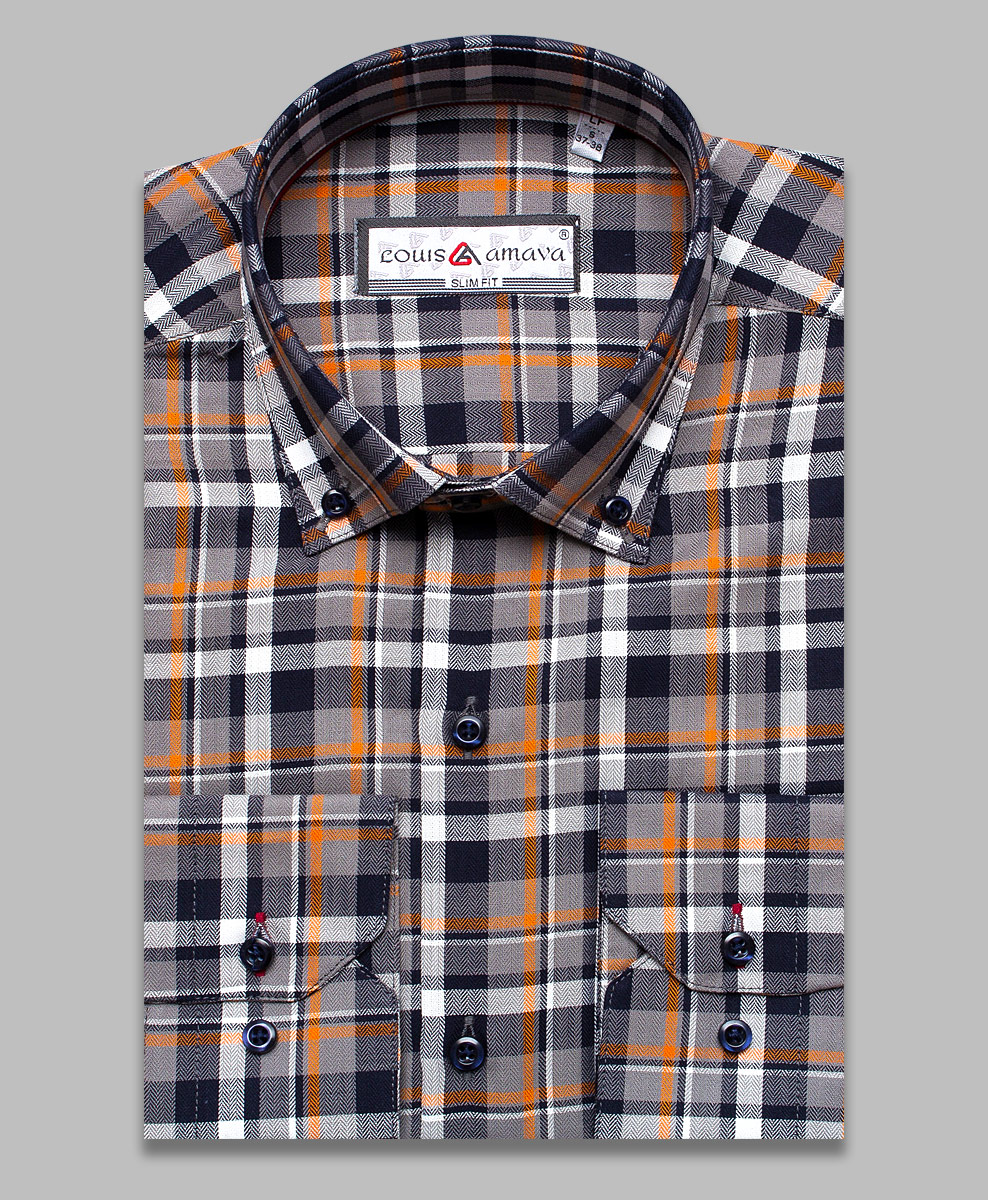 Приталенная мужская рубашка Louis Amava 2210-14 серого цвета в клетку с длинными рукавами и воротником баттен-даун из натуральной 100% хлопковой ткани.