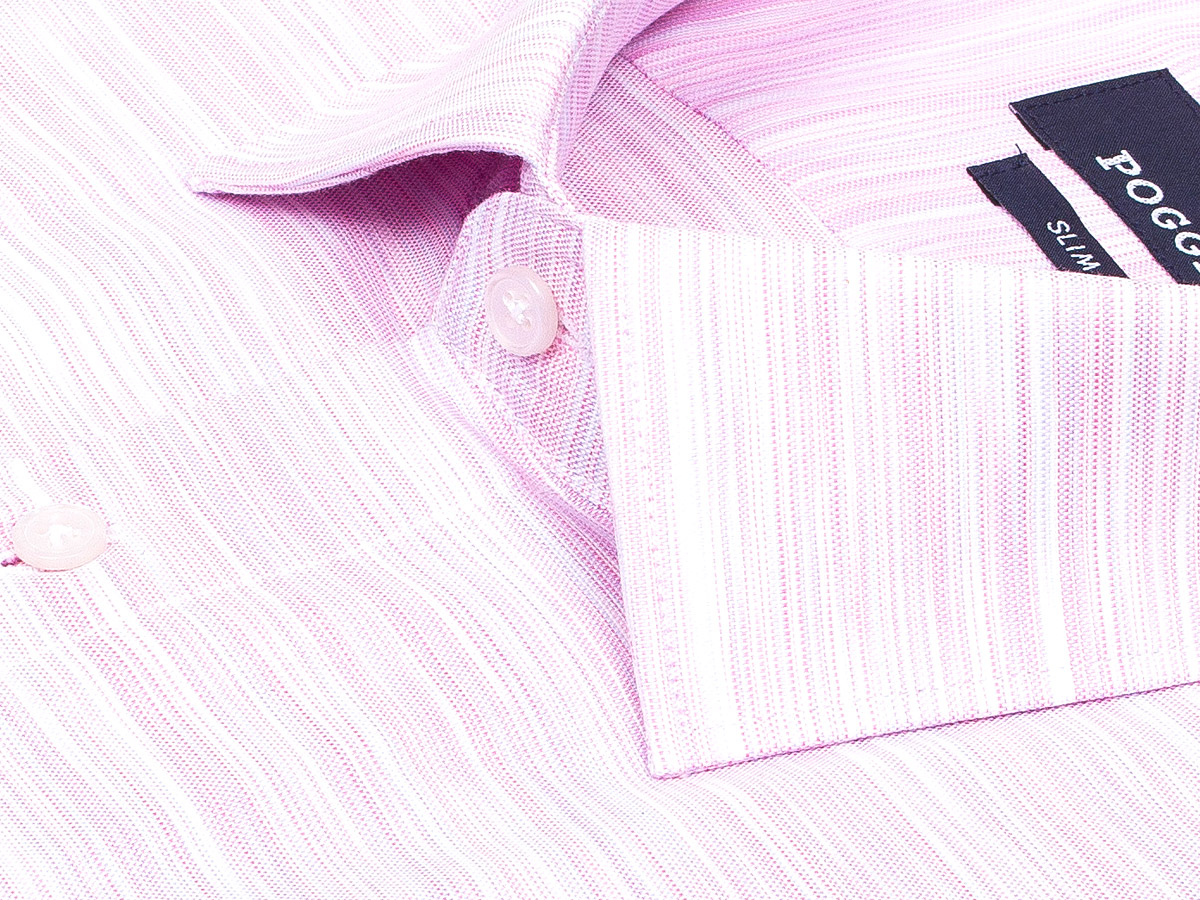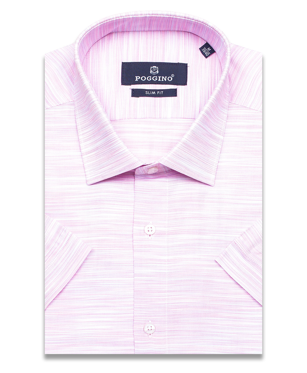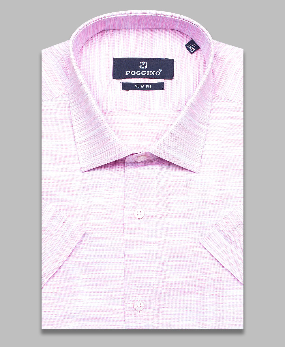 Летняя приталенная мужская рубашка Poggino 7004-26 бледно-розового цвета меланж с классическим воротником и короткими рукавами из натуральной 100% хлопковой ткани.