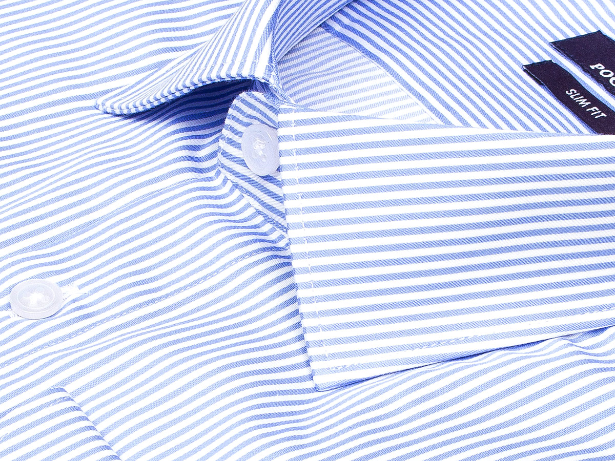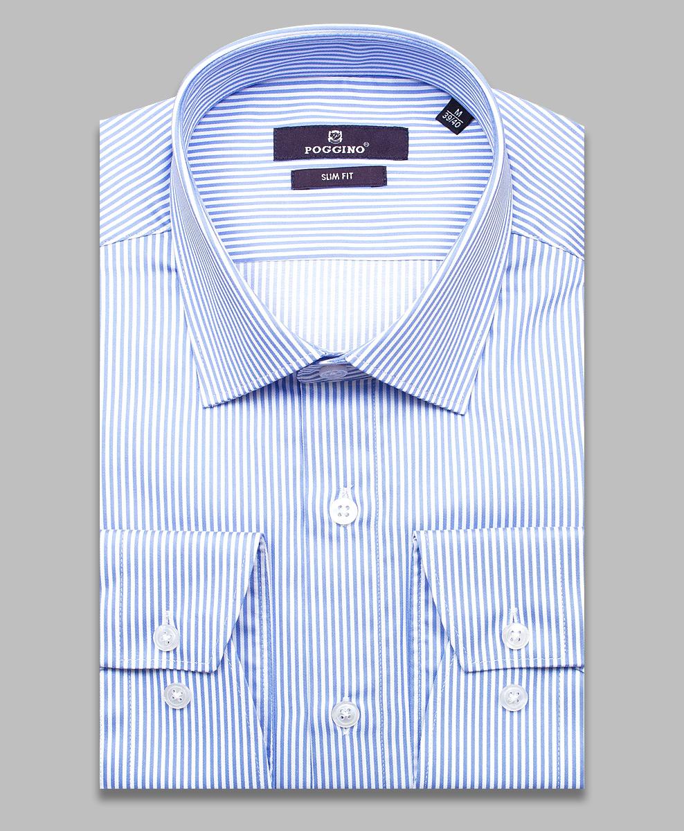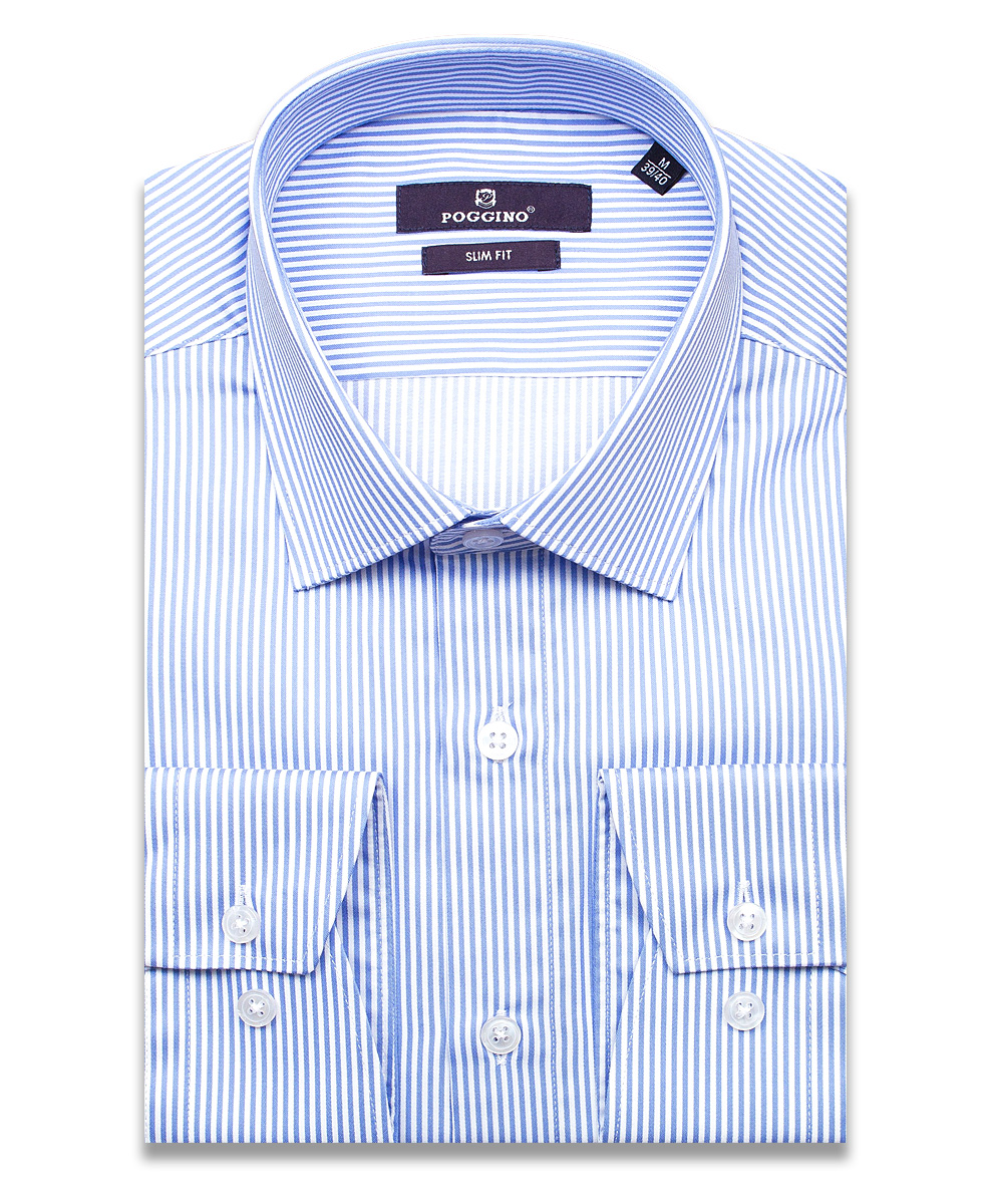 Приталенная мужская рубашка Poggino 7013-78 голубого цвета в полоску с длинными рукавами и классическим воротником из натуральной 100% хлопковой ткани.