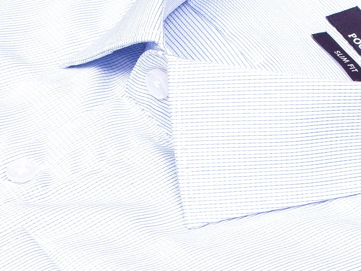 Приталенная мужская рубашка Poggino 7013-74 голубого цвета в полоску с длинными рукавами и классическим воротником из натуральной 100% хлопковой ткани.