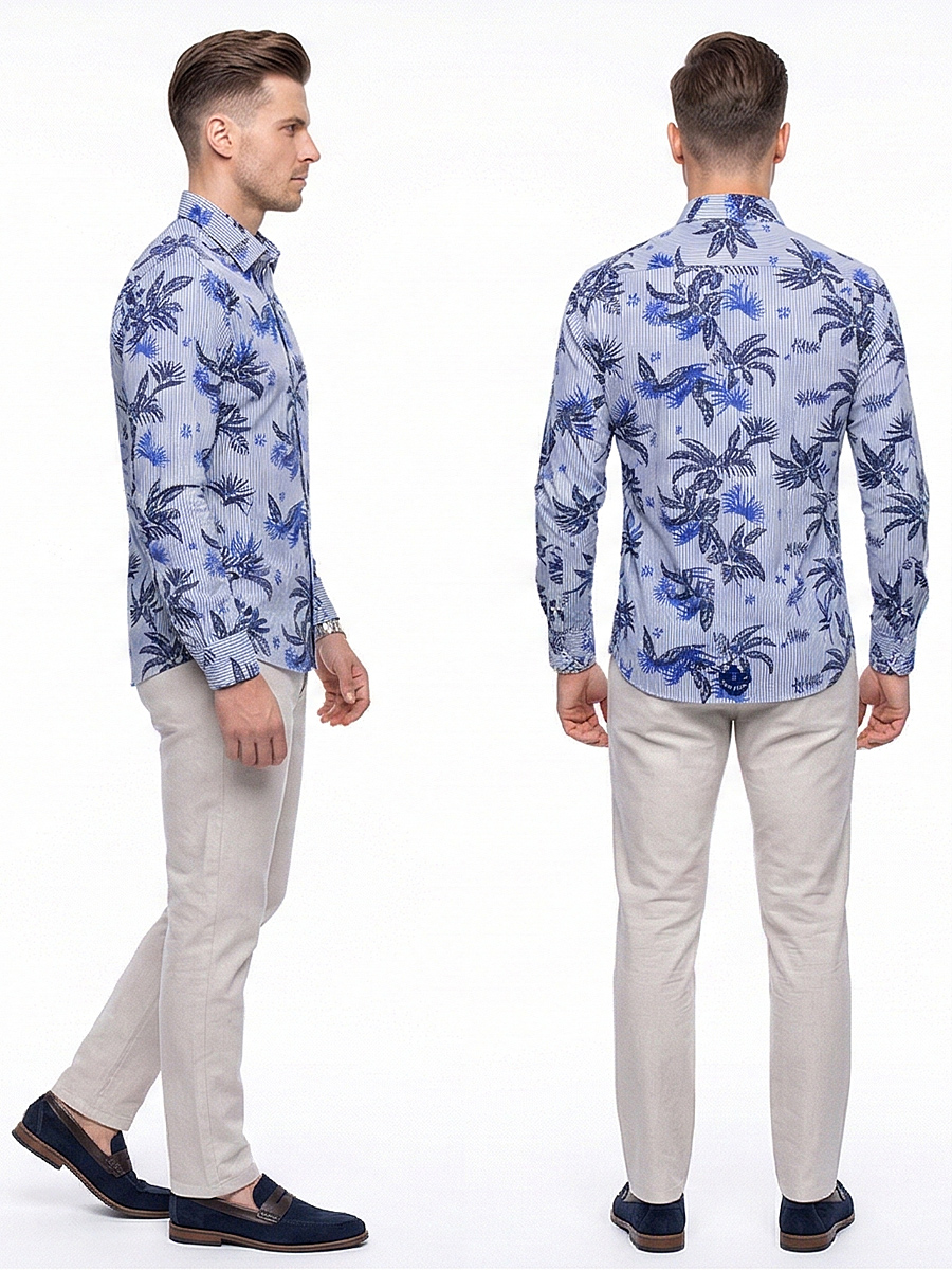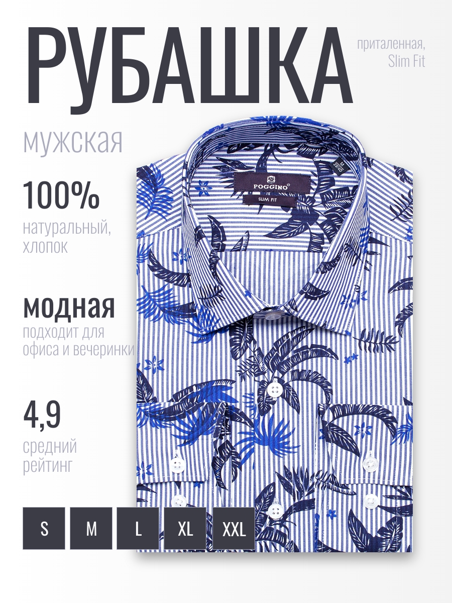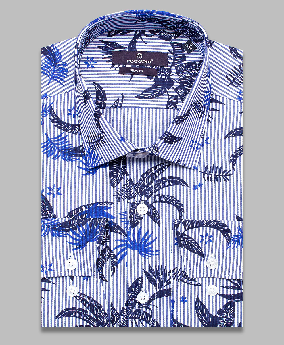 Приталенная мужская рубашка Poggino 7013-89 синего цвета в полоску и листьях с длинным рукавом и классическим воротником из натуральной 100% хлопковой ткани.