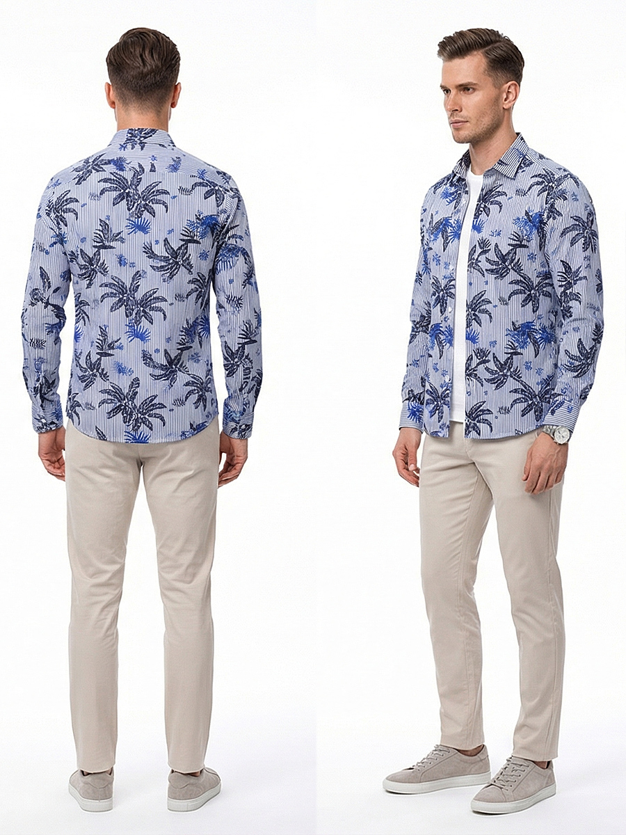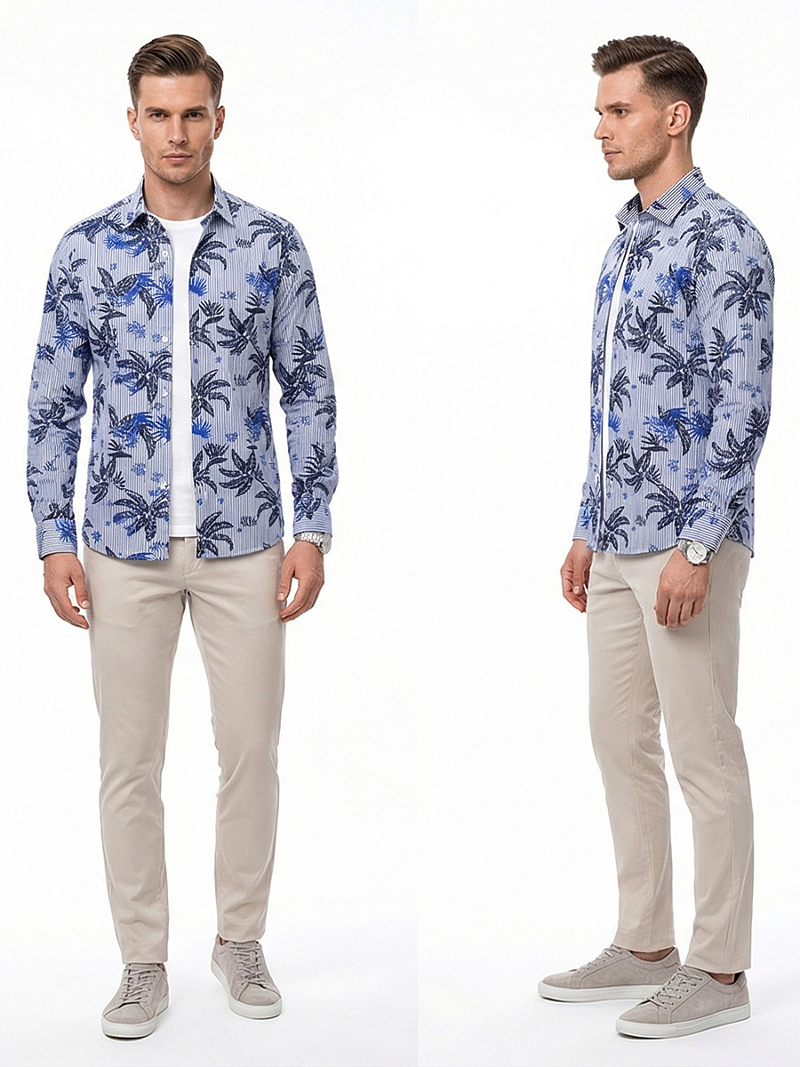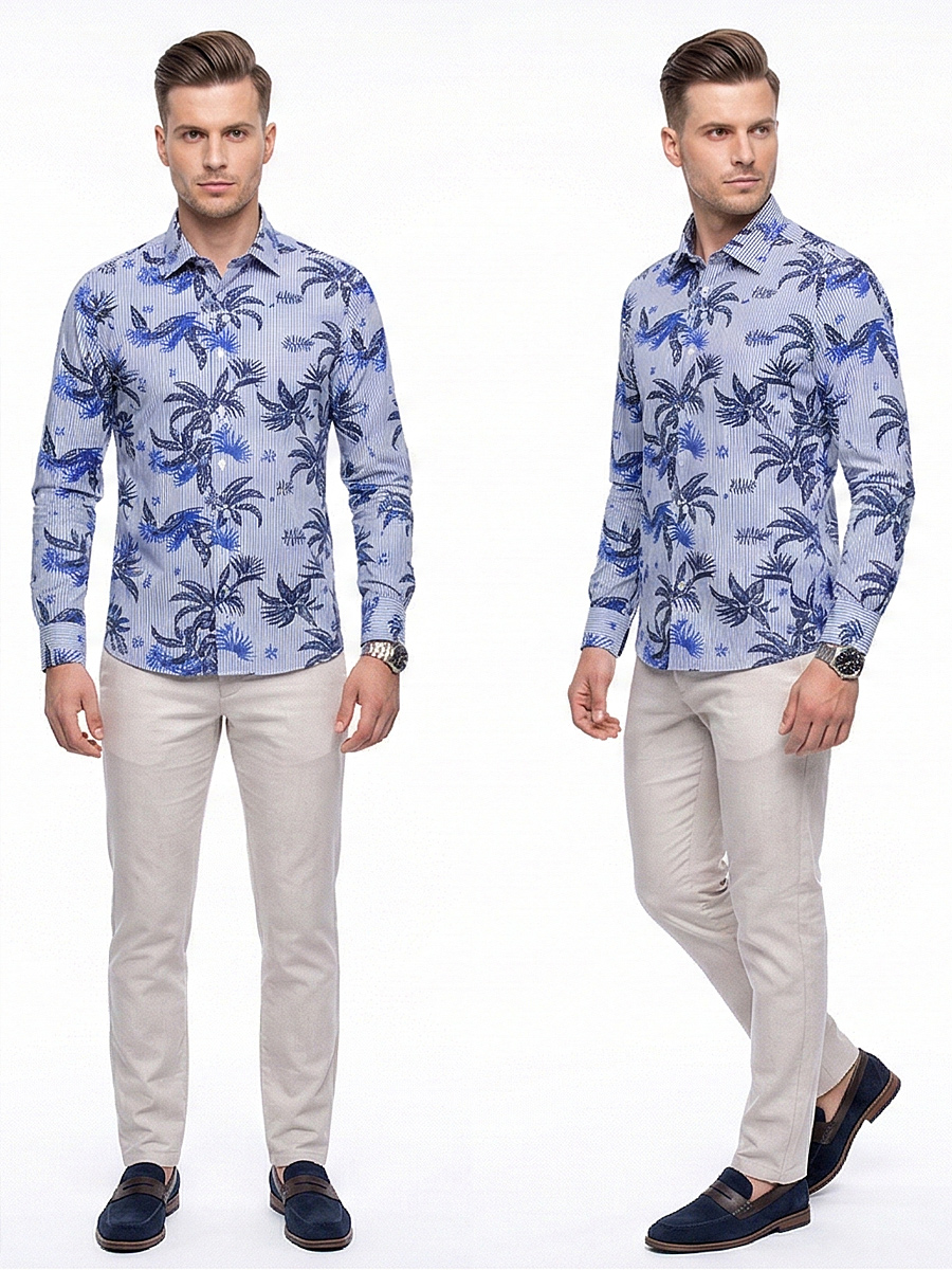 Приталенная мужская рубашка Poggino 7013-89 синего цвета в полоску и листьях с длинным рукавом и классическим воротником из натуральной 100% хлопковой ткани.