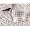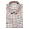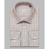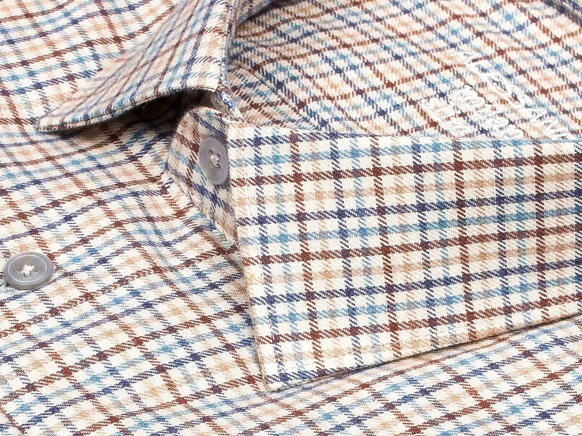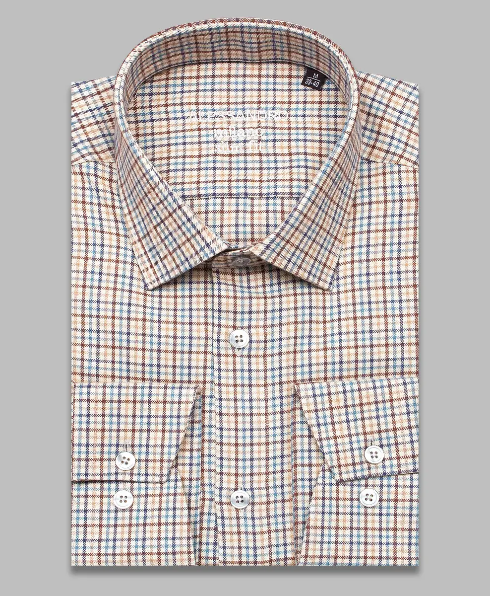 Байковая приталенная мужская рубашка Alessandro Milano 3210-08 бежевого цвета в клетку с длинными рукавами и классическим воротником из натуральной 100% хлопковой ткани.