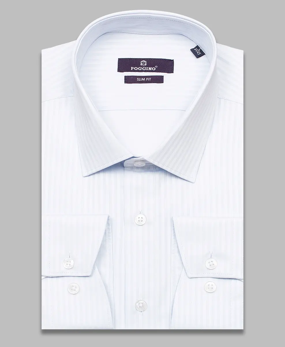 Приталенная мужская рубашка Poggino 7013-93 бледно-голубого цвета в полоску с длинными рукавами и классическим воротником из натуральной 100% хлопковой ткани.