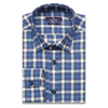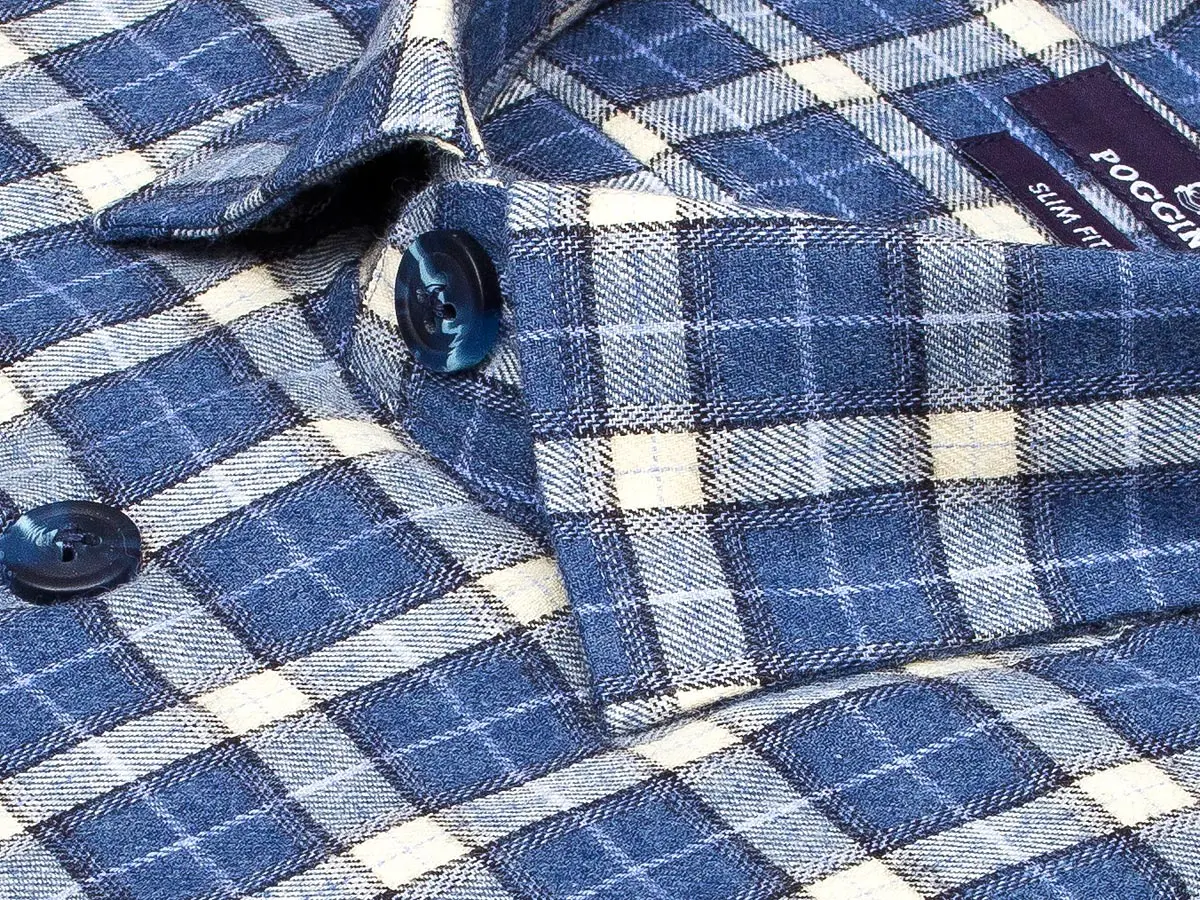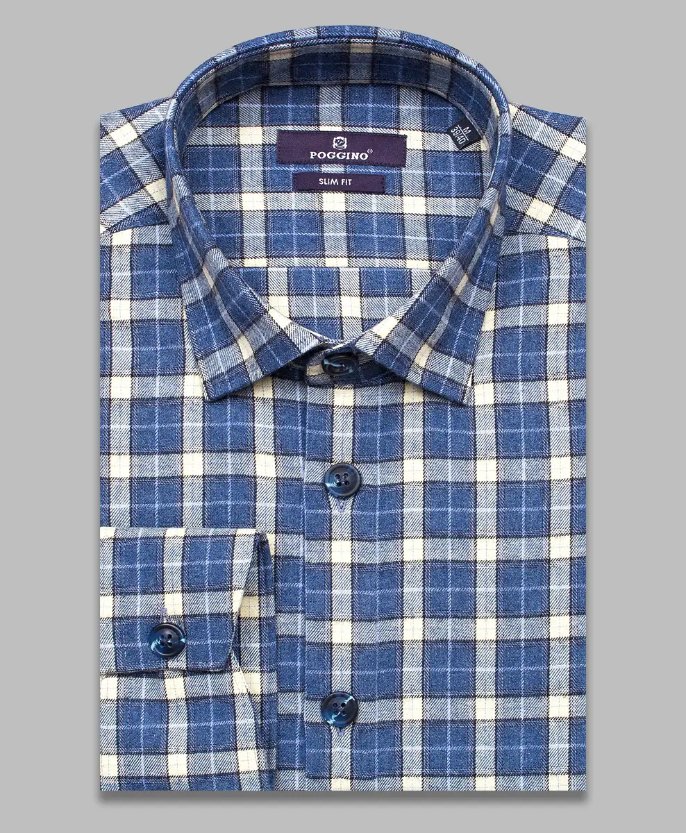 Байковая приталенная мужская рубашка Poggino 7014-47 синего цвета в клетку с длинными рукавами и классическим воротником из натуральной 100% хлопковой ткани.