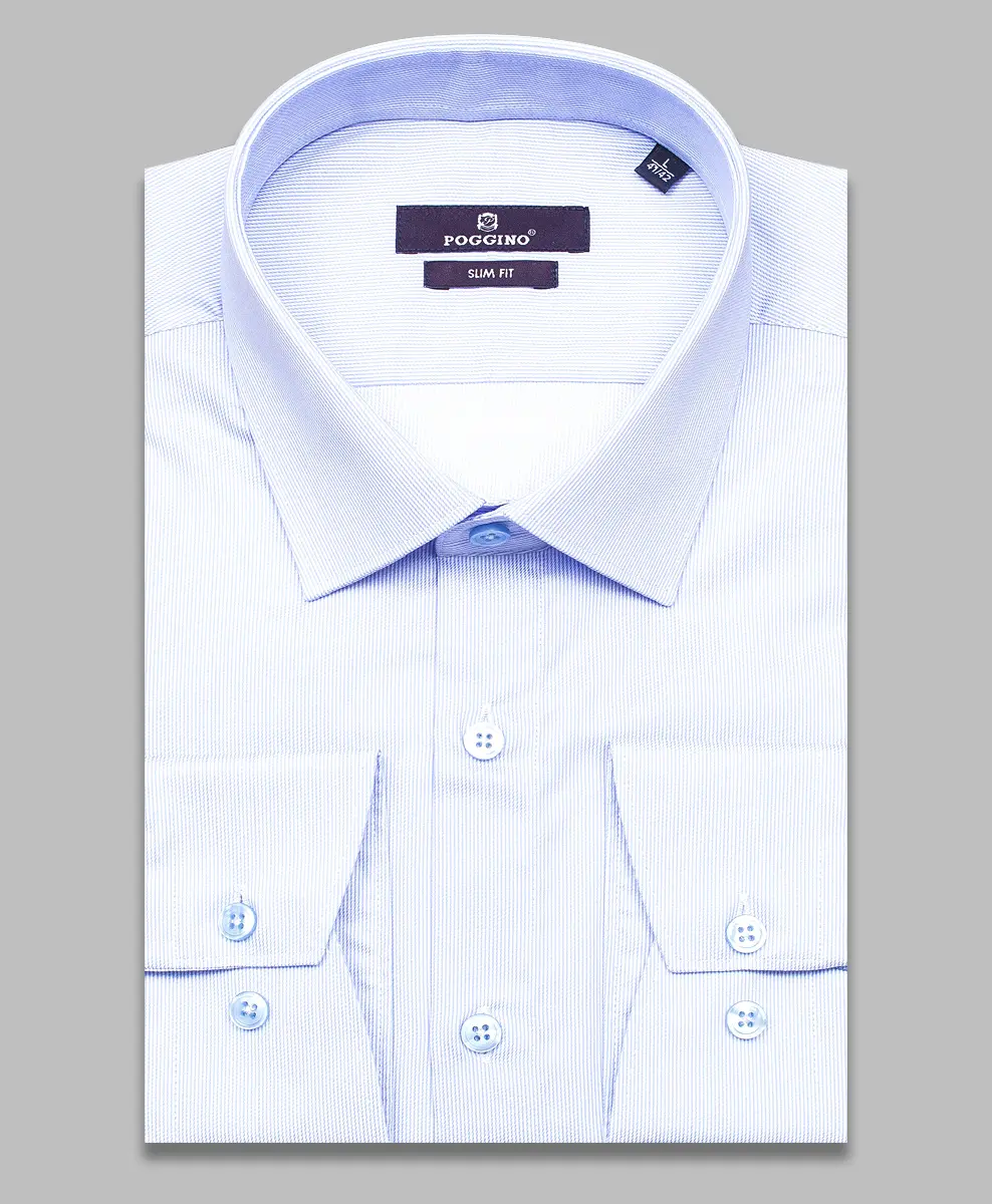 Приталенная мужская рубашка Poggino 7013-99 голубого цвета в полоску с длинными рукавами и классическим воротником из натуральной 100% хлопковой ткани.