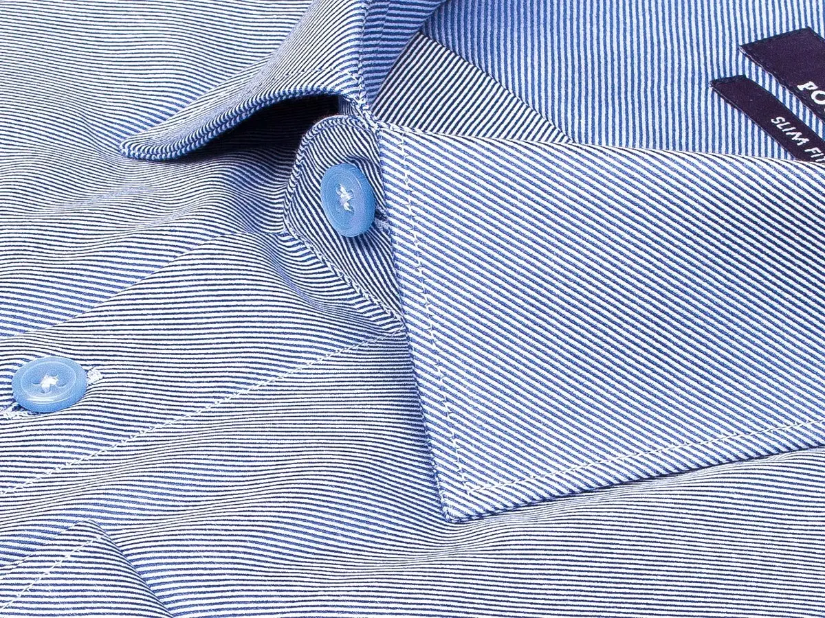 Приталенная мужская рубашка Poggino 7013-77 синего цвета в полоску с длинным рукавом и классическим воротником из натуральной 100% хлопковой ткани.