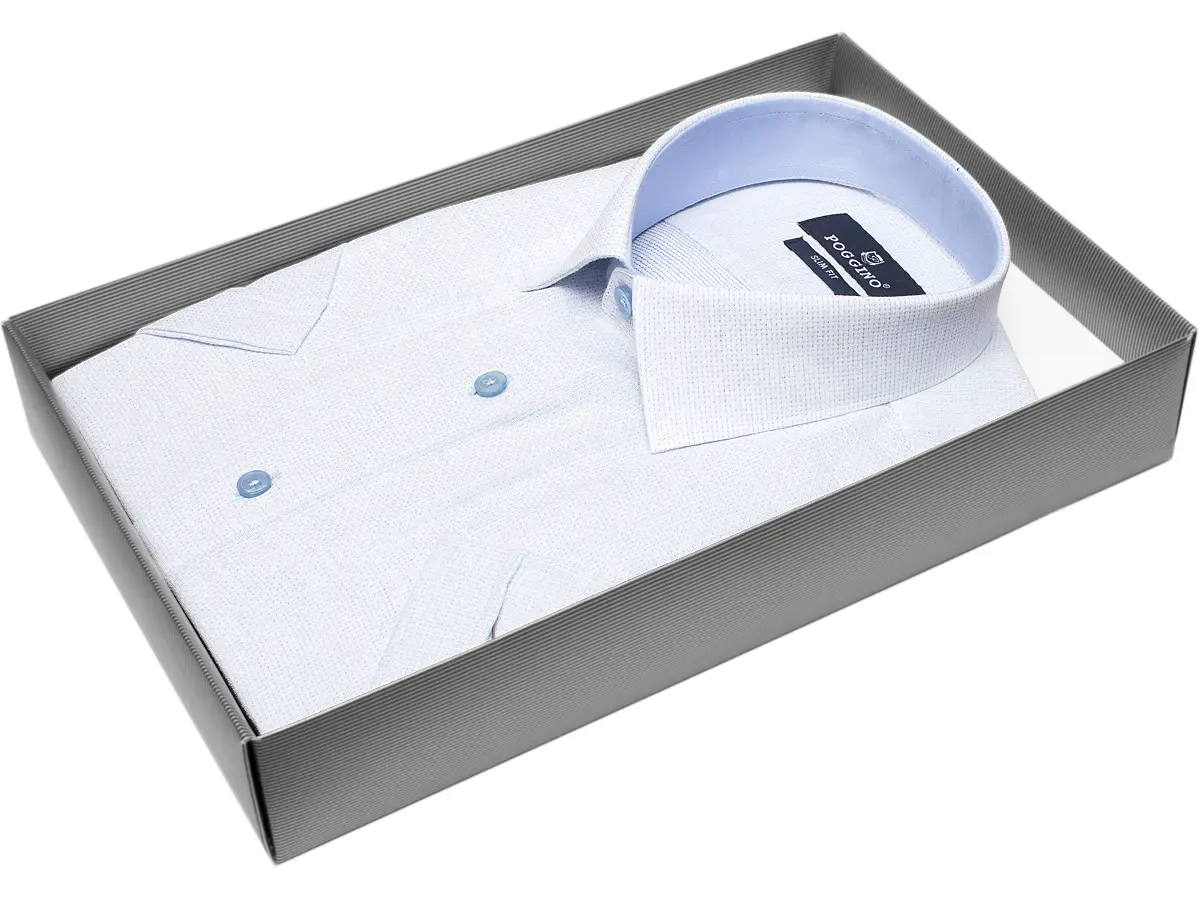Приталенная мужская рубашка Poggino 7014-53 голубого цвета с длинными рукавами и классическим воротником из натуральной 100% хлопковой ткани.