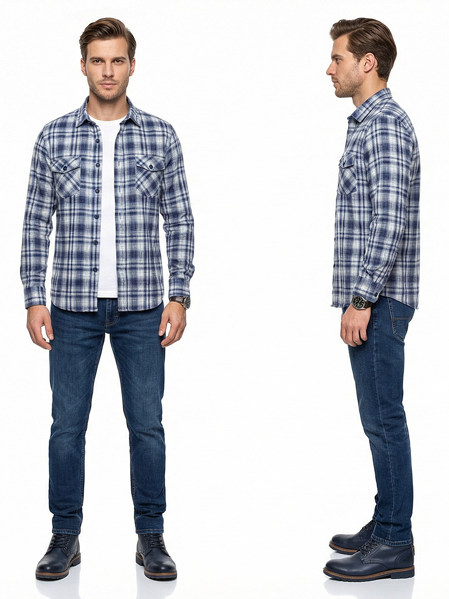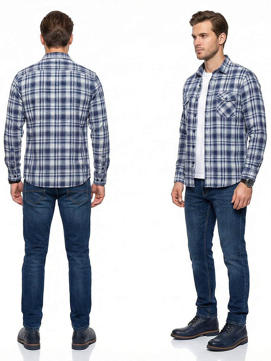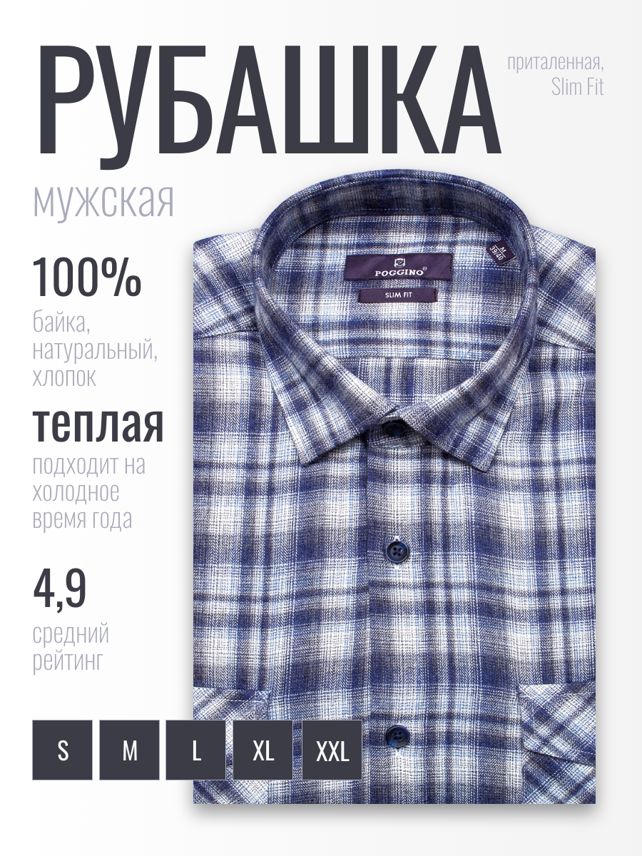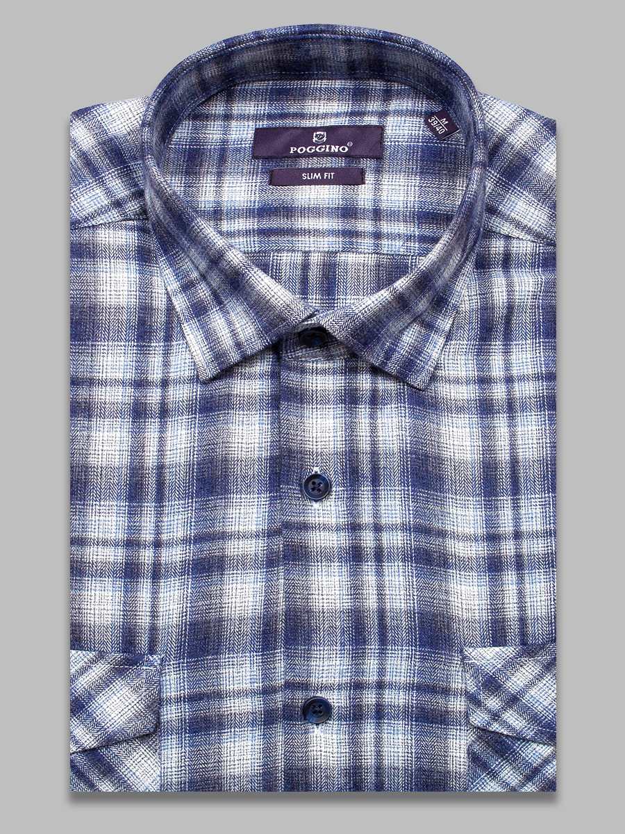 Байковая приталенная мужская рубашка Poggino 7017-17 синего цвета в клетку с длинными рукавами и классическим воротником и двумя нагрудными карманами из натуральной 100% хлопковой ткани.