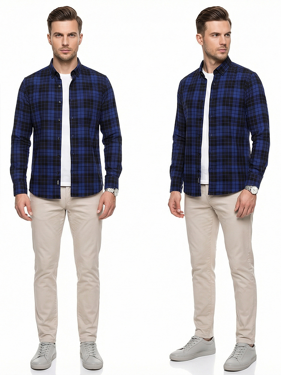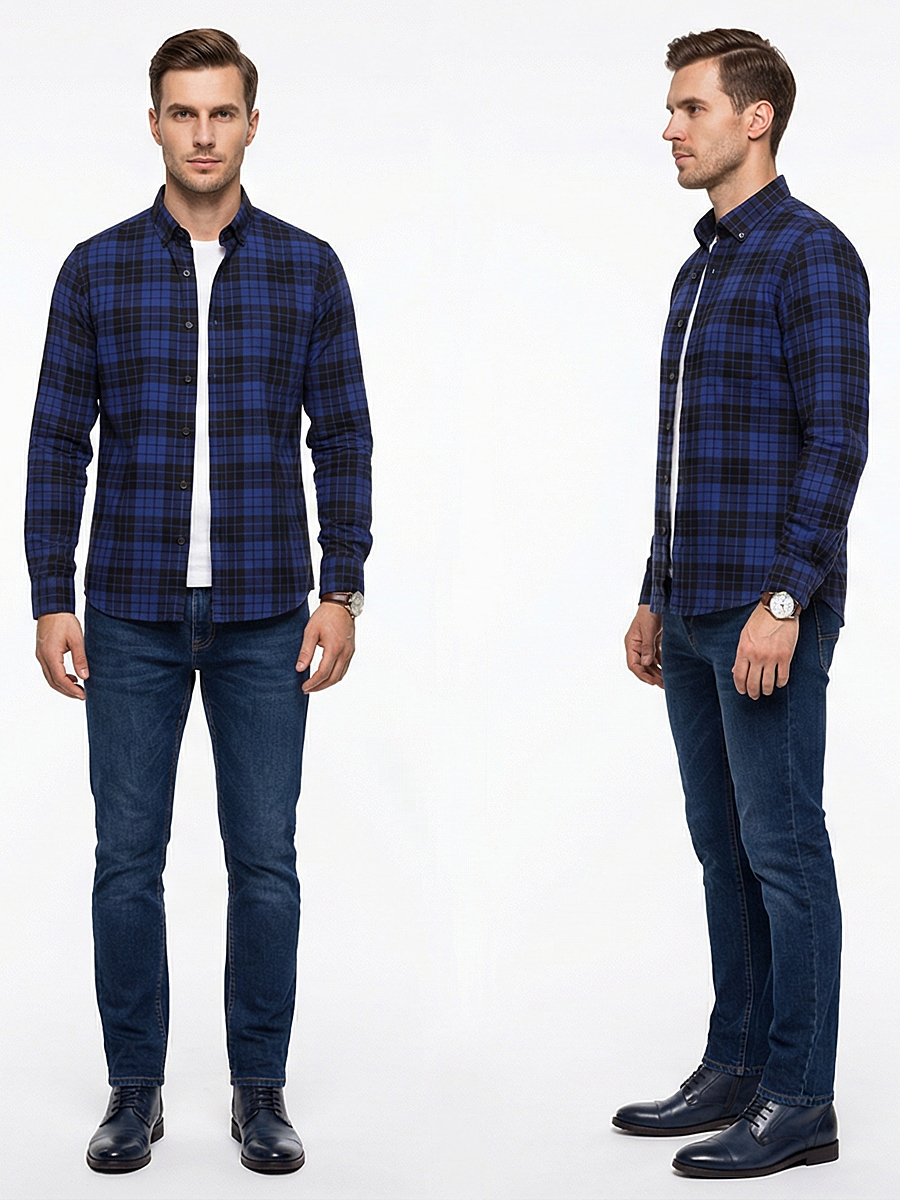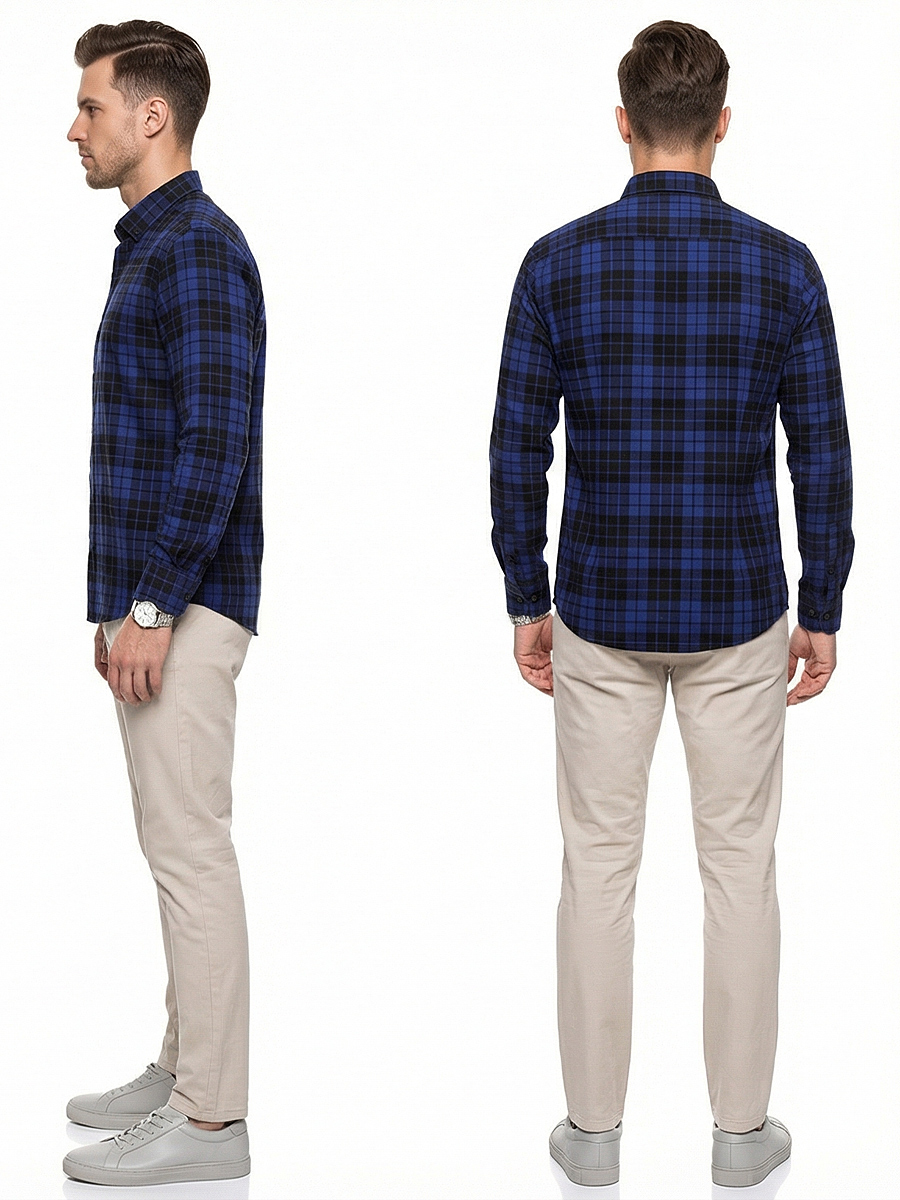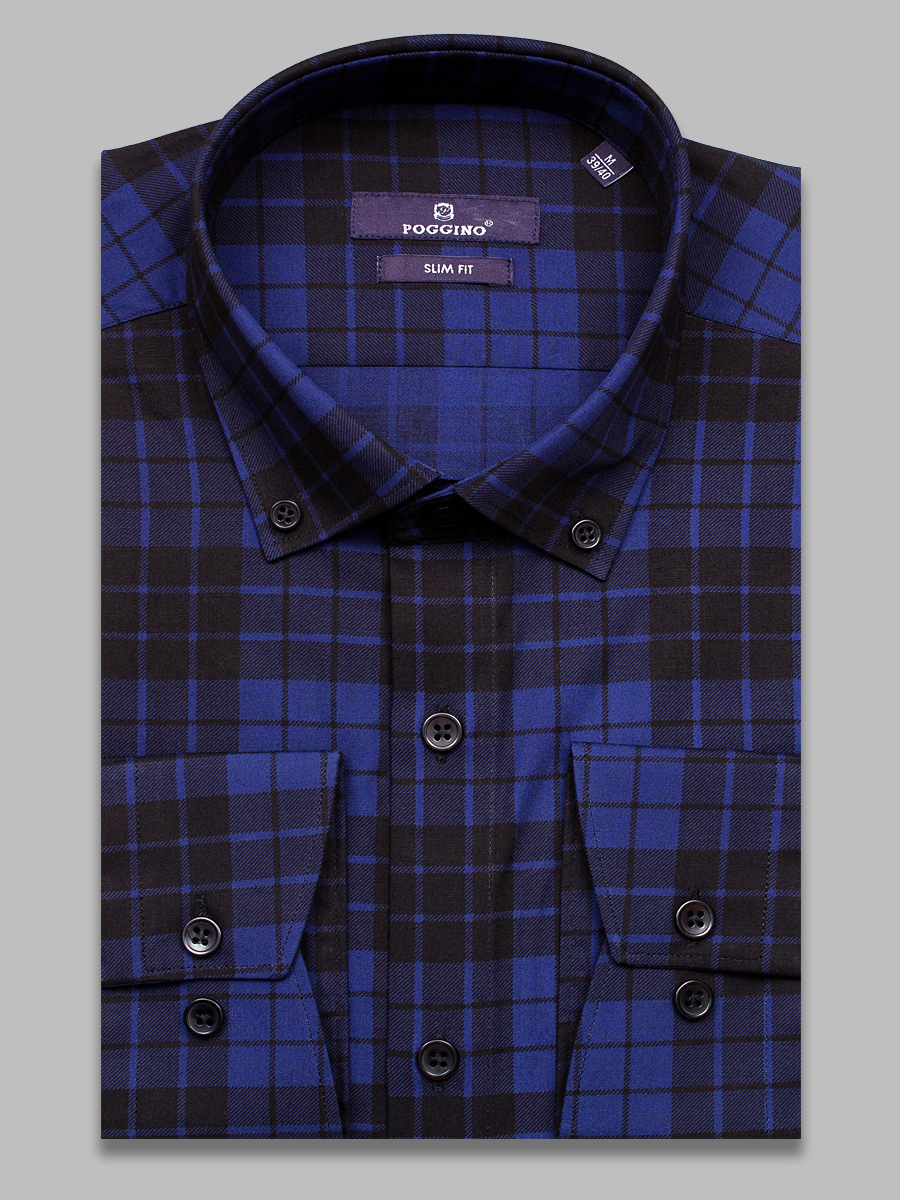 Темно-синяя приталенная мужская рубашка в клетку с длинными рукавами