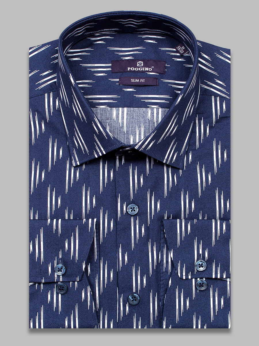 Приталенная мужская рубашка Poggino 7017-41 темно-синего цвета узорах с длинными рукавами и классическим воротником из плотной натуральной 100% хлопковой ткани.