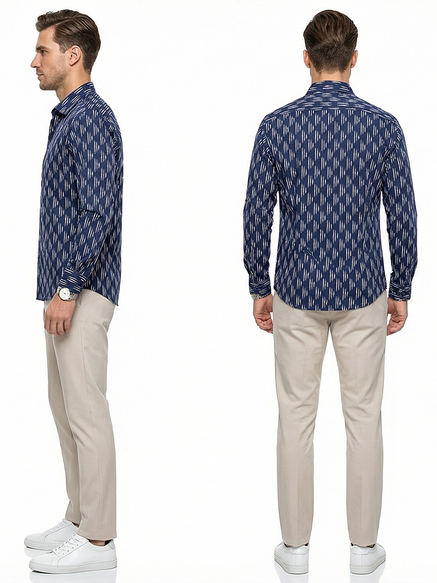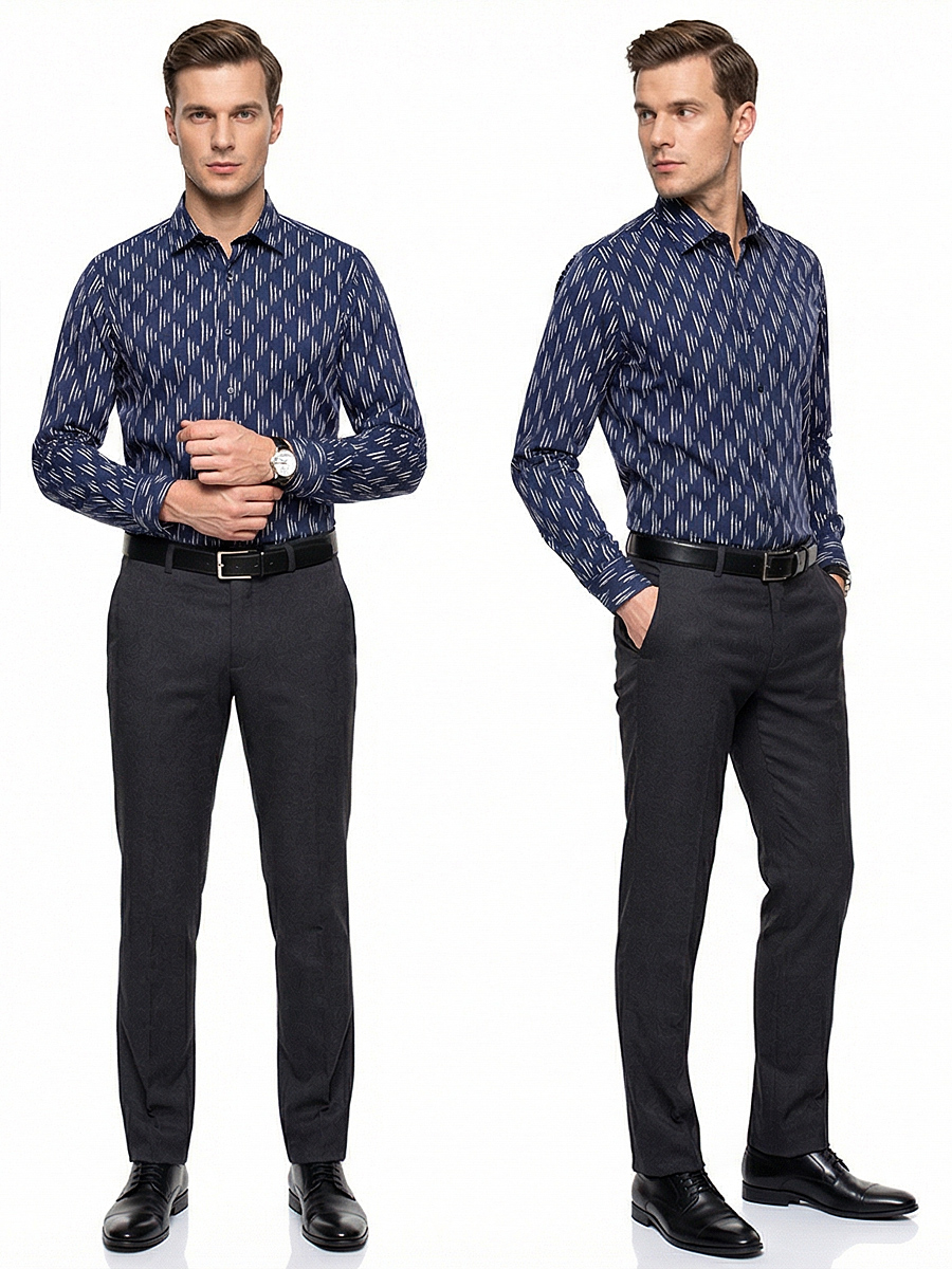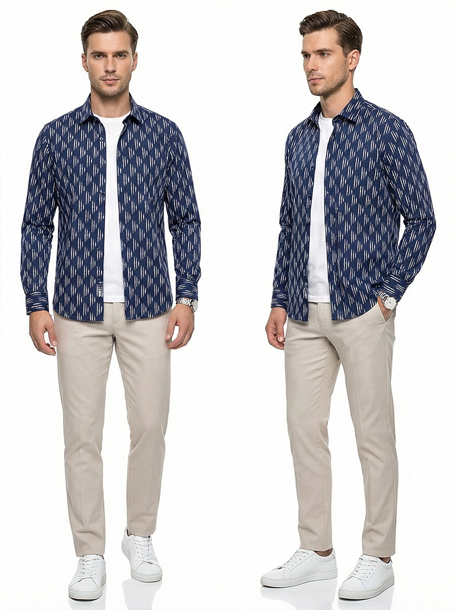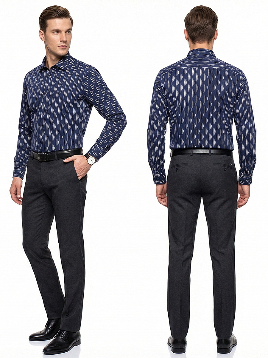 Темно-синяя приталенная мужская рубашка в узорах с длинными рукавами