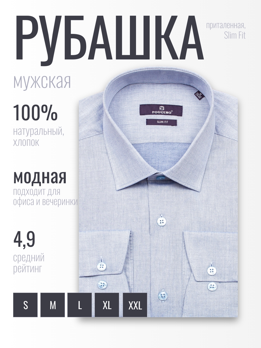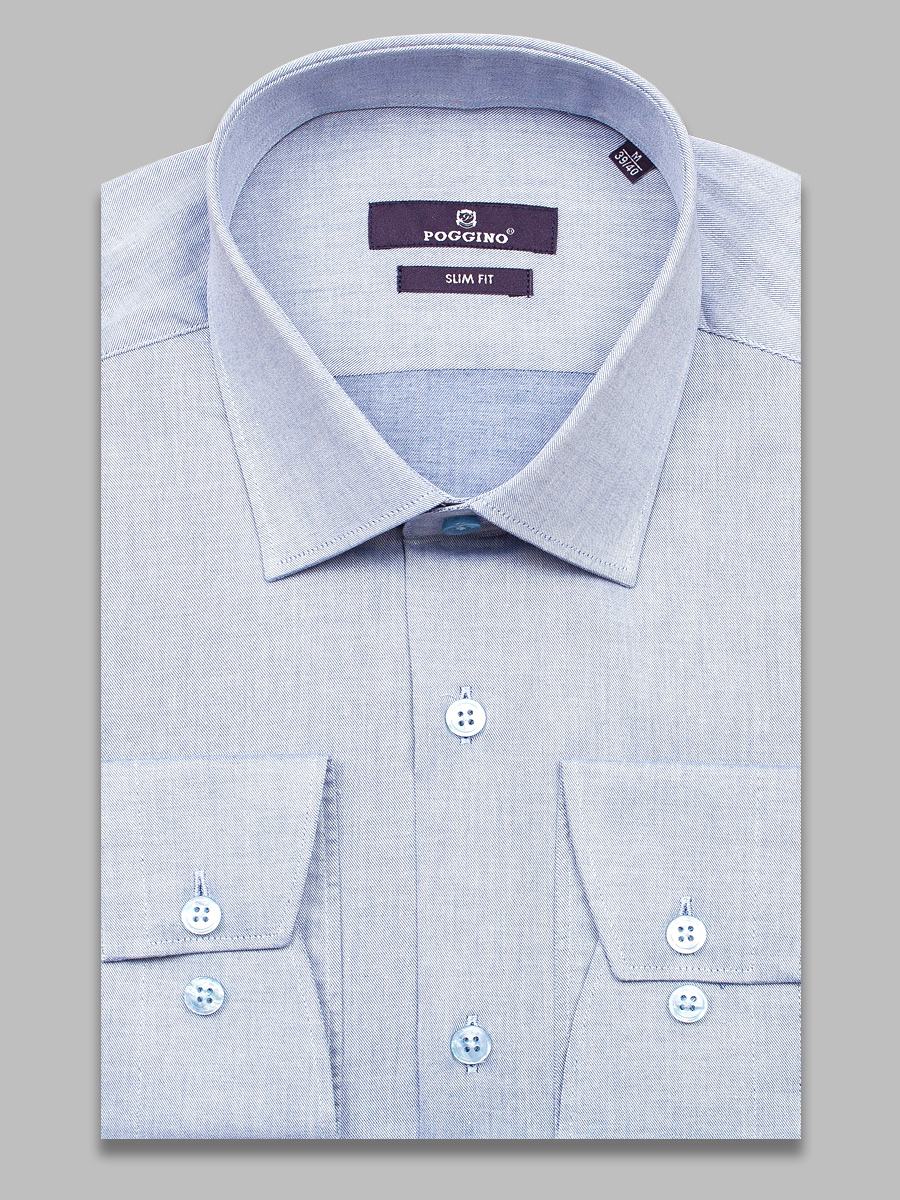 Приталенная мужская рубашка Poggino 7017-74 голубого цвета меланж с классическим воротником и длинными рукавами из натуральной 100% хлопковой ткани.