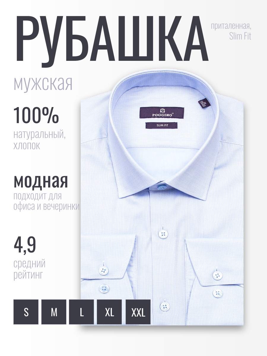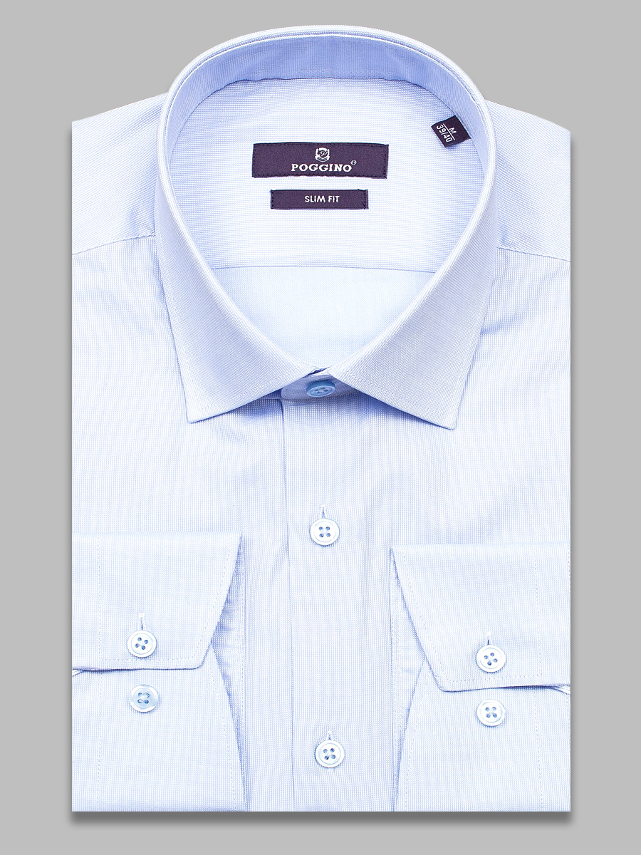Приталенная мужская рубашка Poggino 7017-47 голубого цвета с длинными рукавами и классическим воротником из натуральной 100% хлопковой ткани.