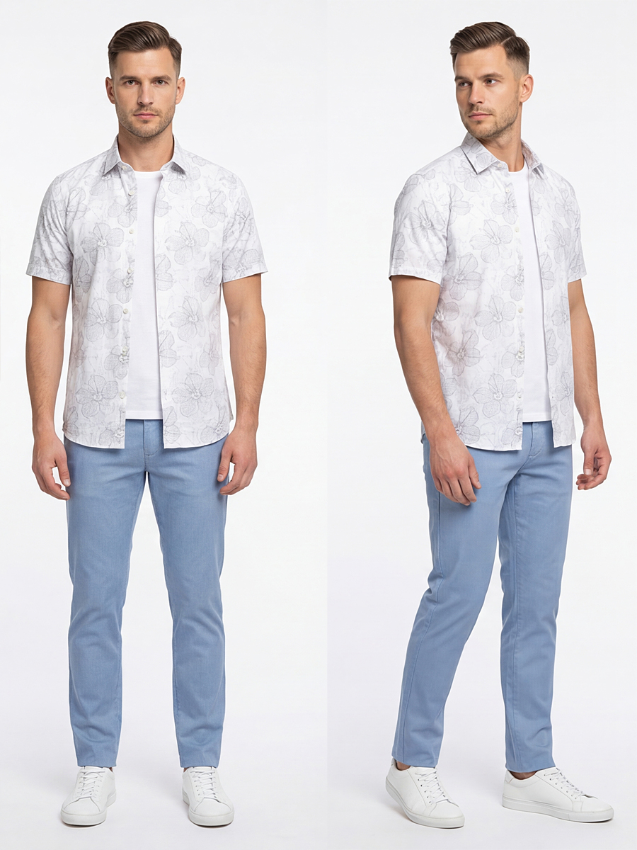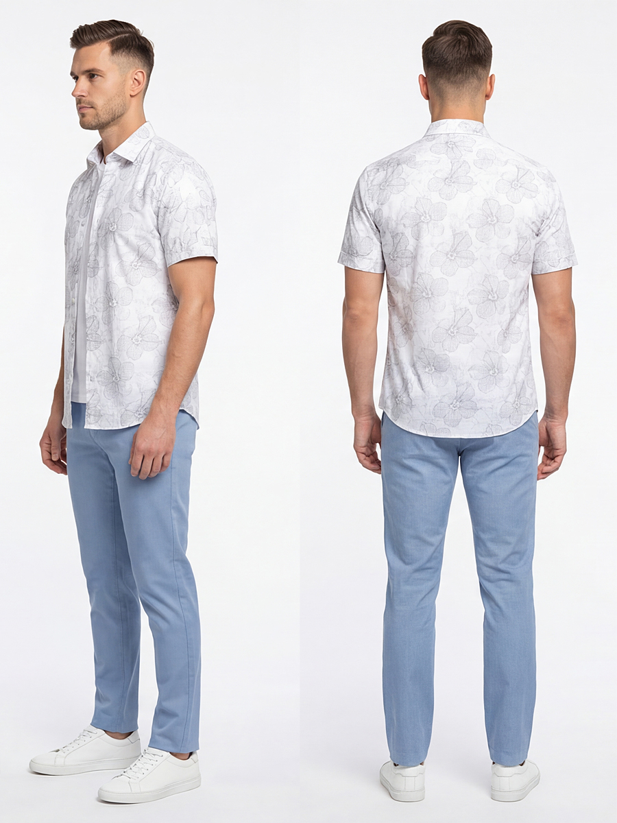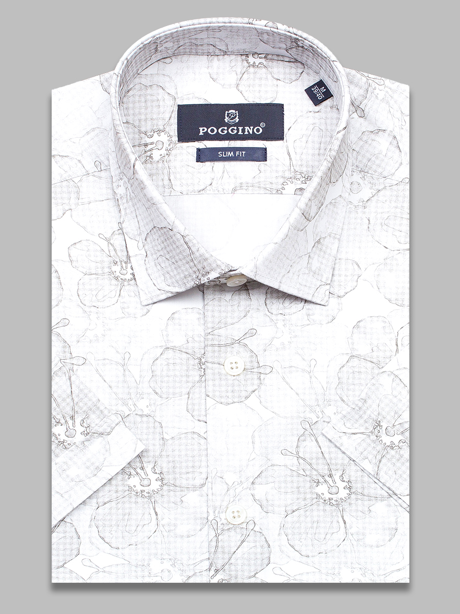 Рубашка представлена в сером цвете с флористическим принтом, что делает ее актуальной для любого сезона.