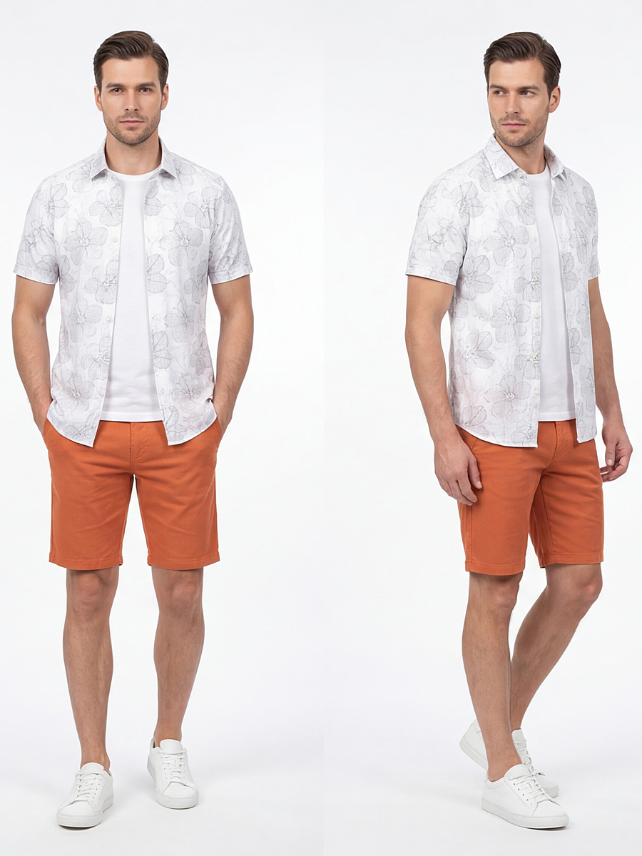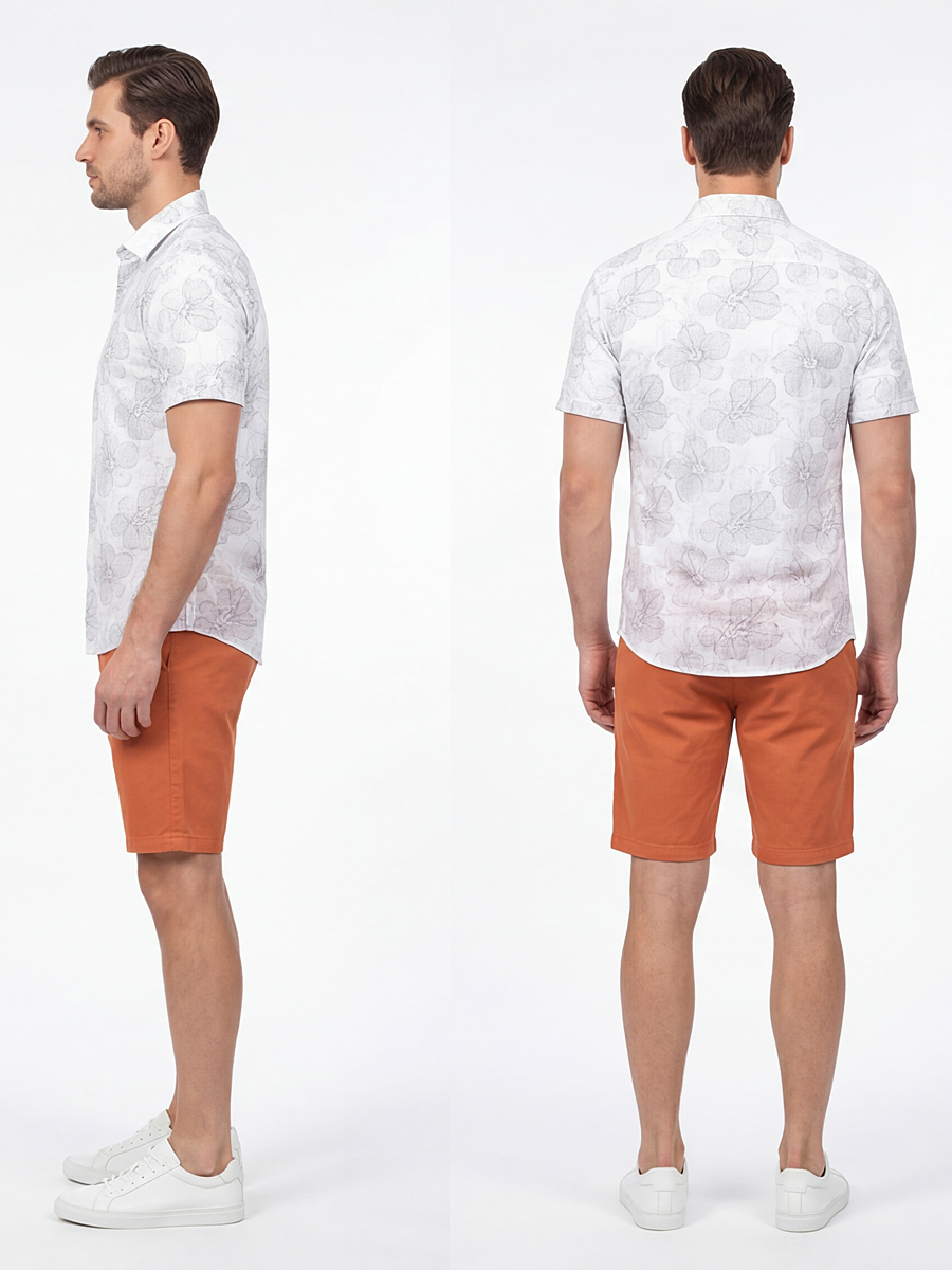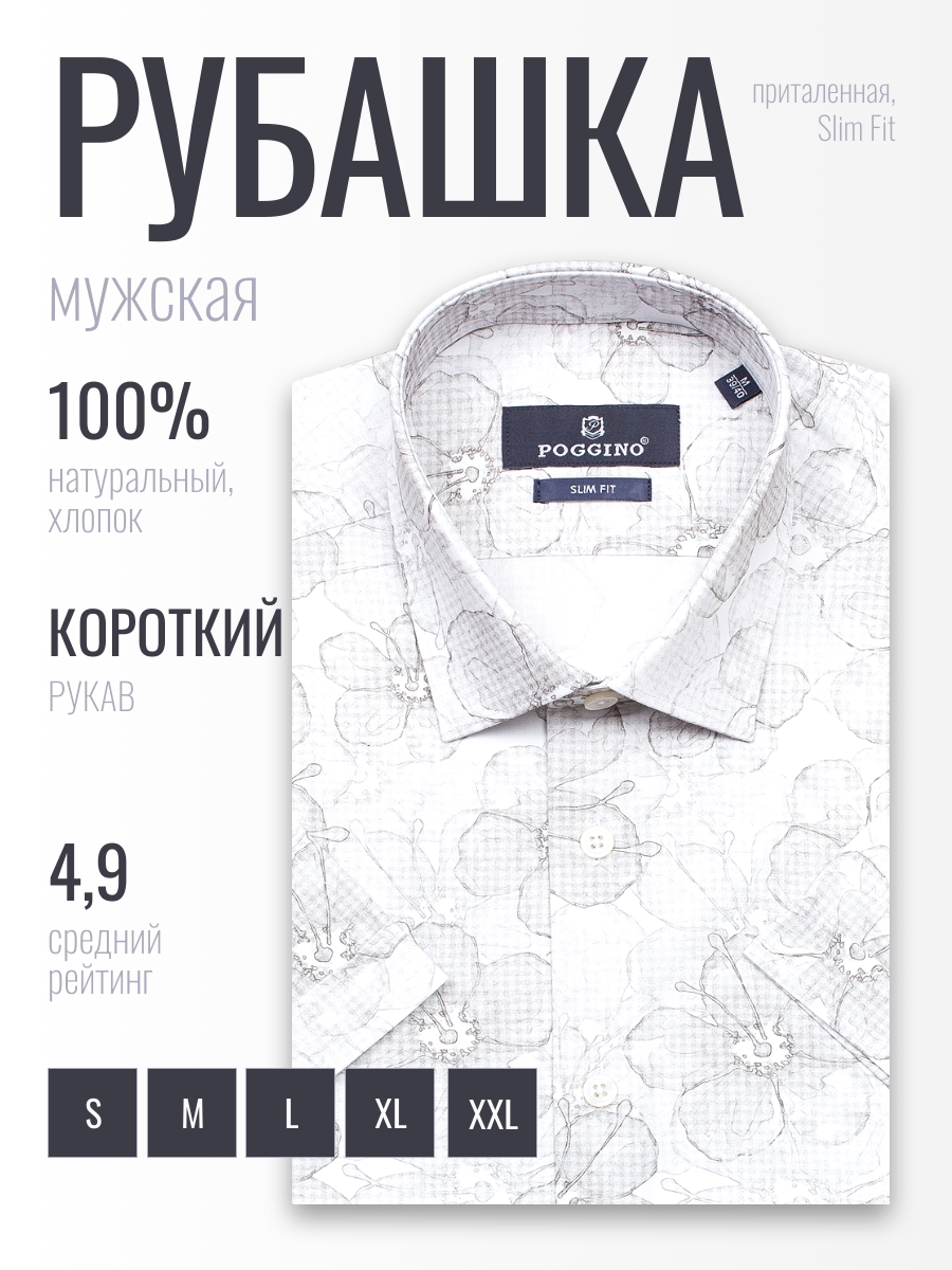 Силуэт рубашки приталенный, что подчеркивает фигуру и делает образ более элегантным. Рубашка имеет короткий рукав и классический воротник, что придает ей классический и сдержанный вид.