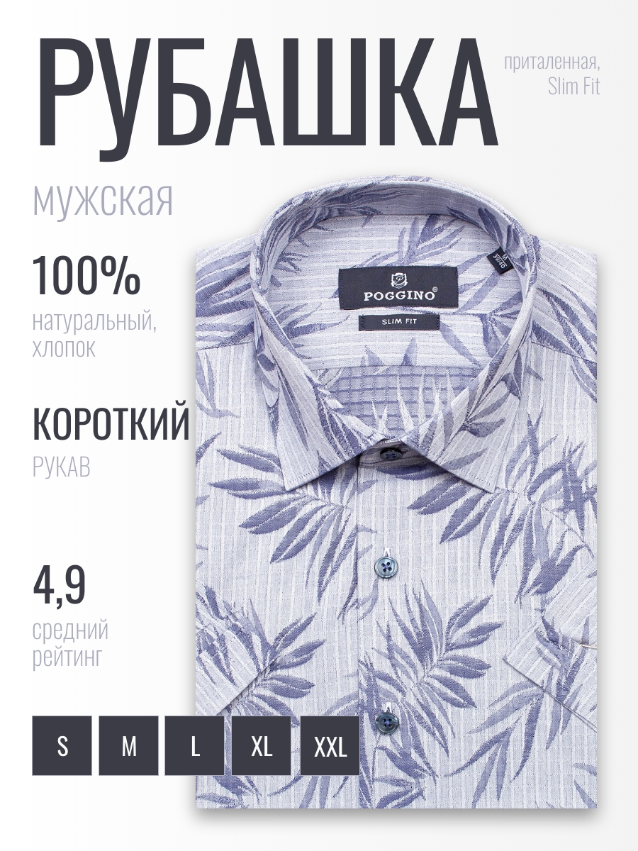 Приталенная мужская рубашка Poggino 7004-48 синего цвета с коротким рукавом и классическим воротником из натуральной 100% хлопковой ткани.
