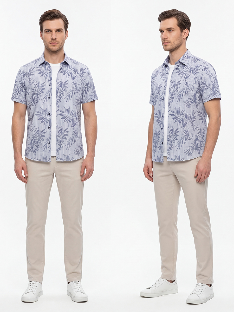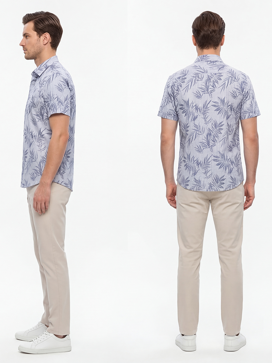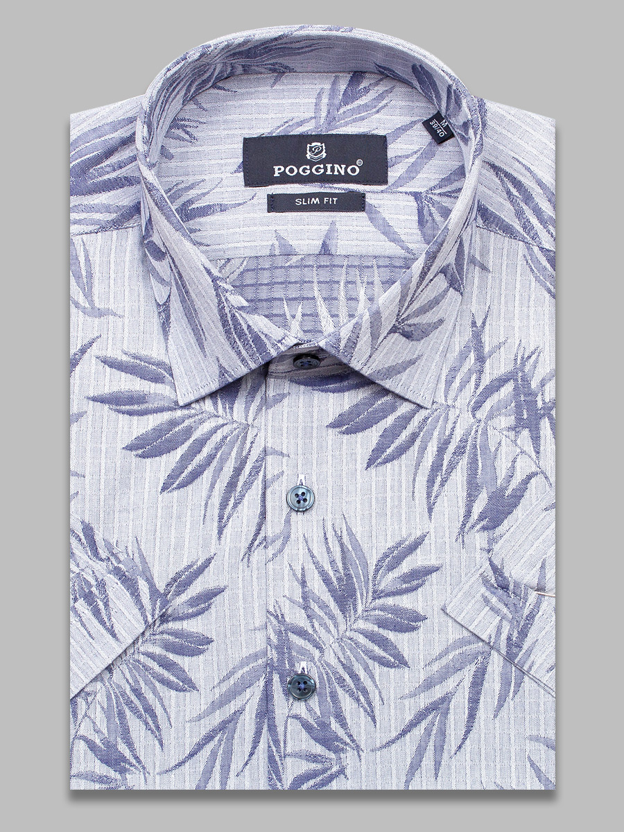 Синяя приталенная рубашка в листьях с коротким рукавом