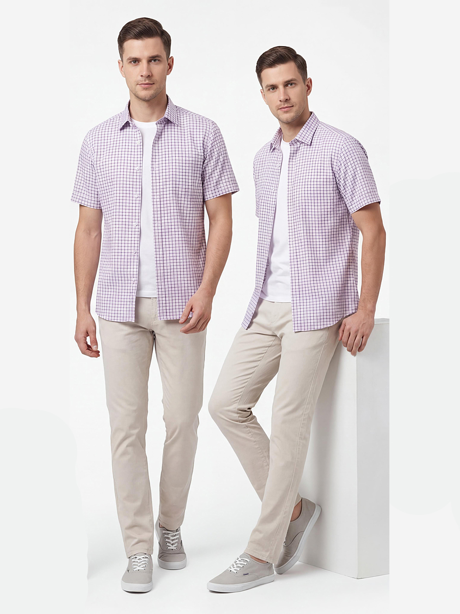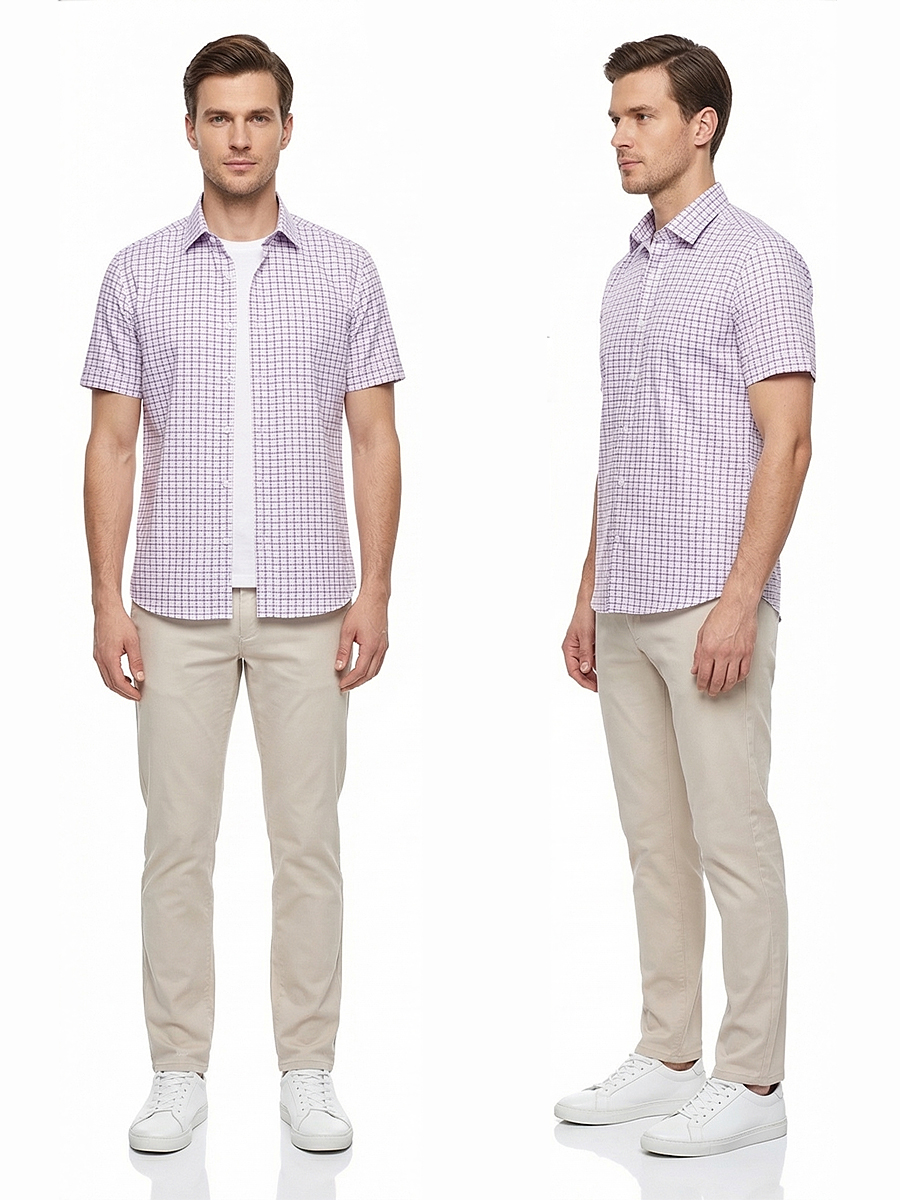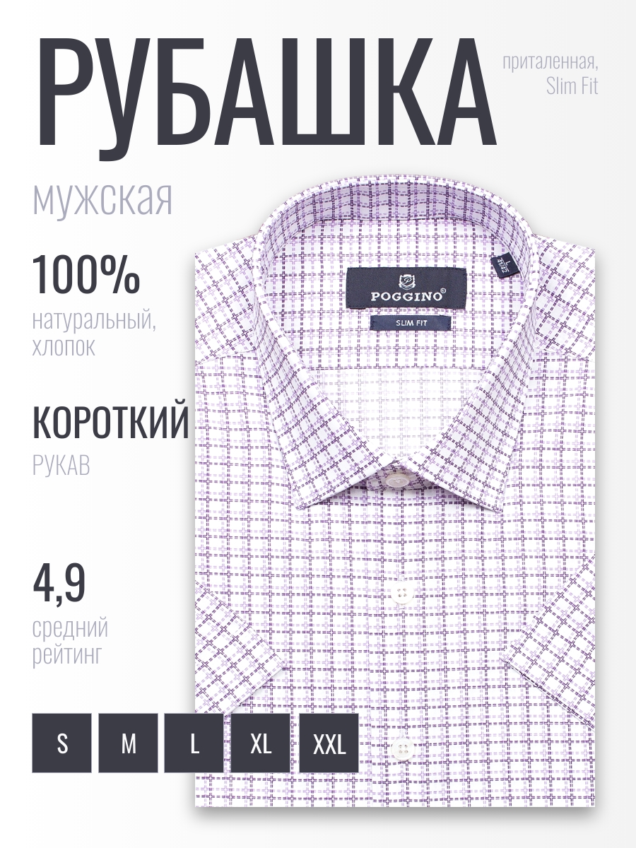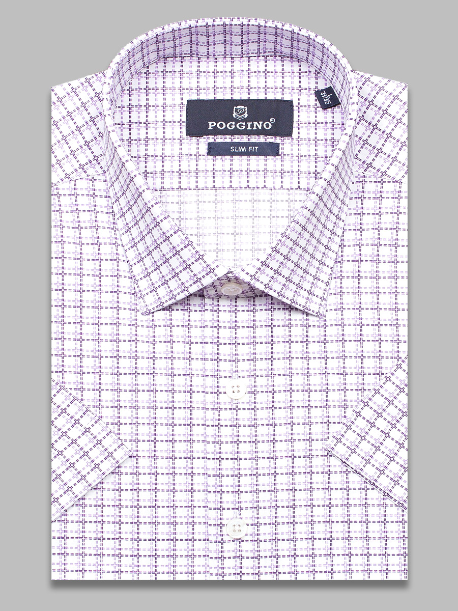 Приталенная мужская рубашка Poggino 7004-38 сиреневого цвета в клетку с коротким рукавом и классическим воротником из натуральной 100% хлопковой ткани.