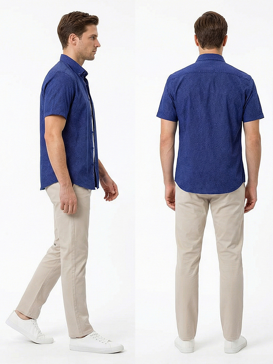 Синяя приталенная рубашка в отрезках с короткими рукавами