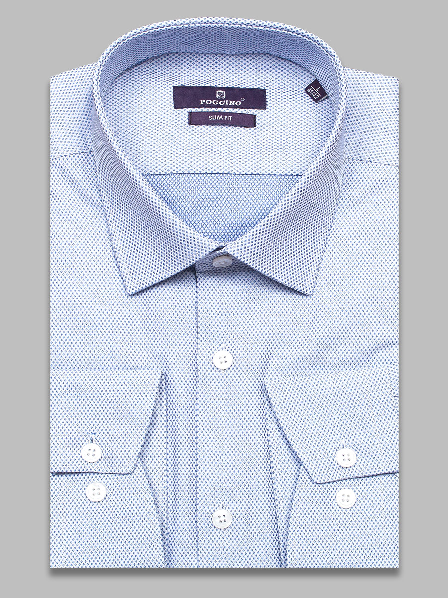 Приталенная мужская рубашка Poggino 7018-24 светло-синего цвета в клетку с длинными рукавами и классическим воротником из натуральной 100% хлопковой ткани.