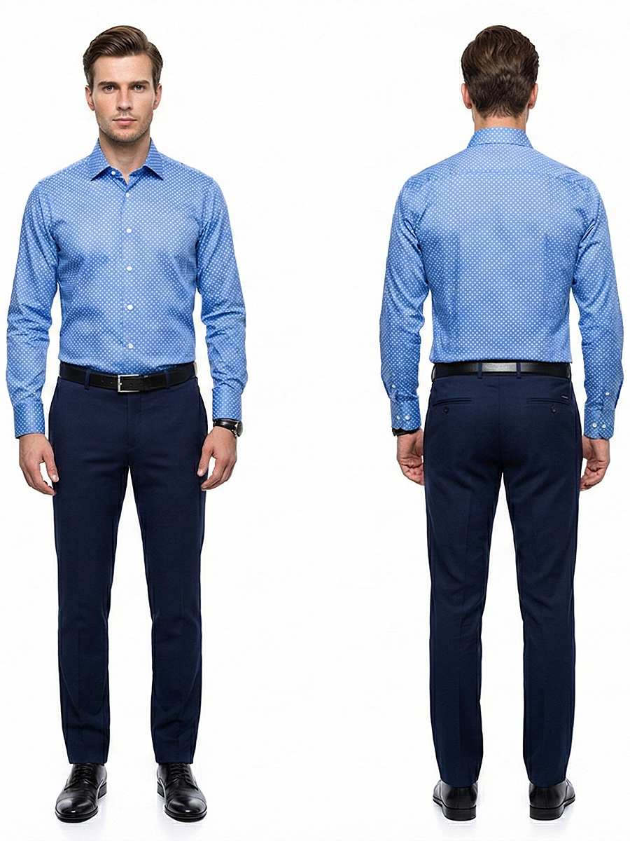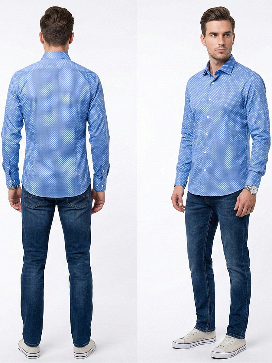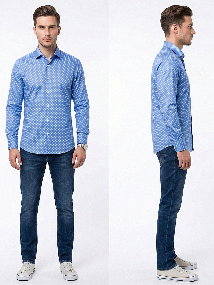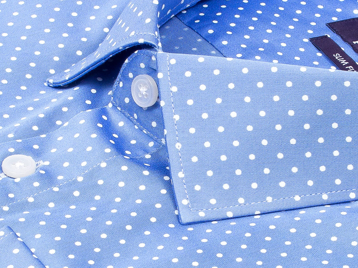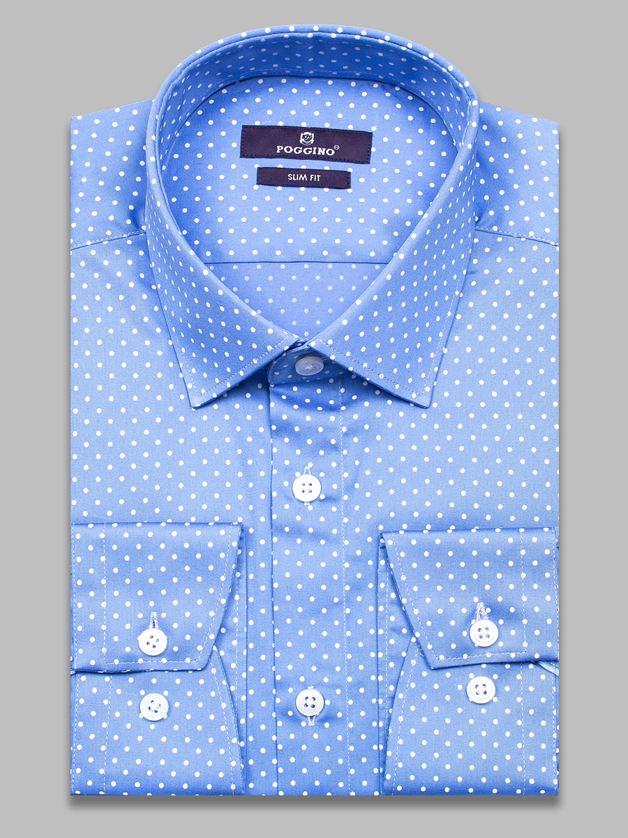 Синяя приталенная рубашка в горошек с длинными рукавами