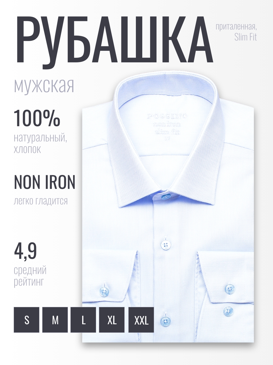 Приталенная мужская рубашка Poggino 8002-02 Non Iron голубого цвета с длинными рукавами и классическим воротником из натуральной 100% хлопковой ткани.