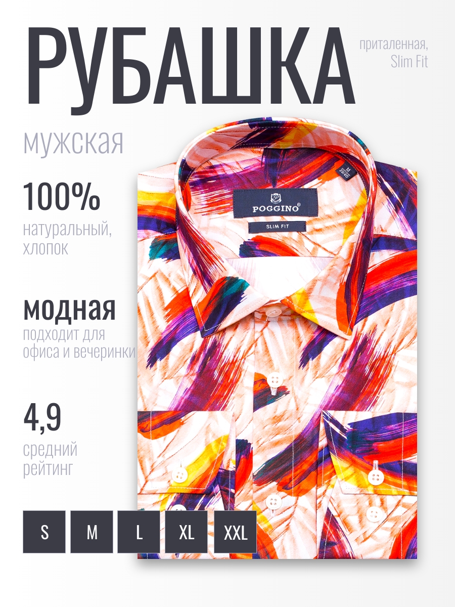 Разноцветная приталенная мужская рубашка Poggino 5010-06 в абстракции с длинными рукавами и классическим воротником из натуральной 100% хлопковой ткани.