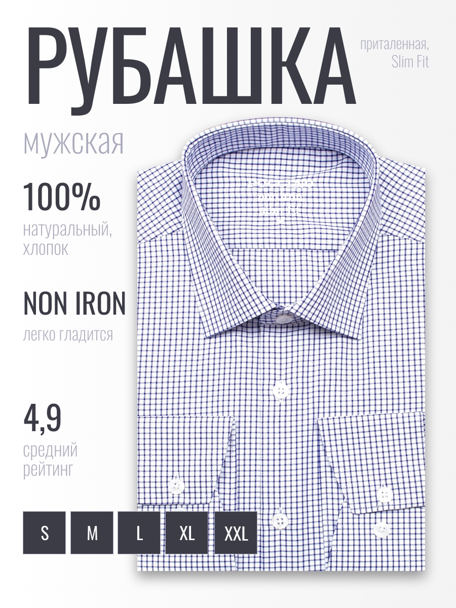 Синяя приталенная мужская рубашка Non Iron в клетку с длинными рукавами