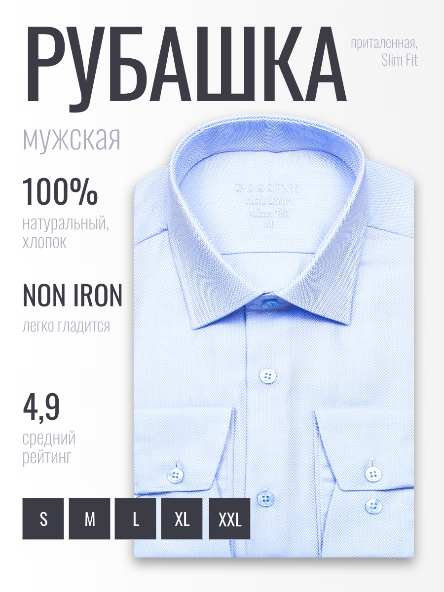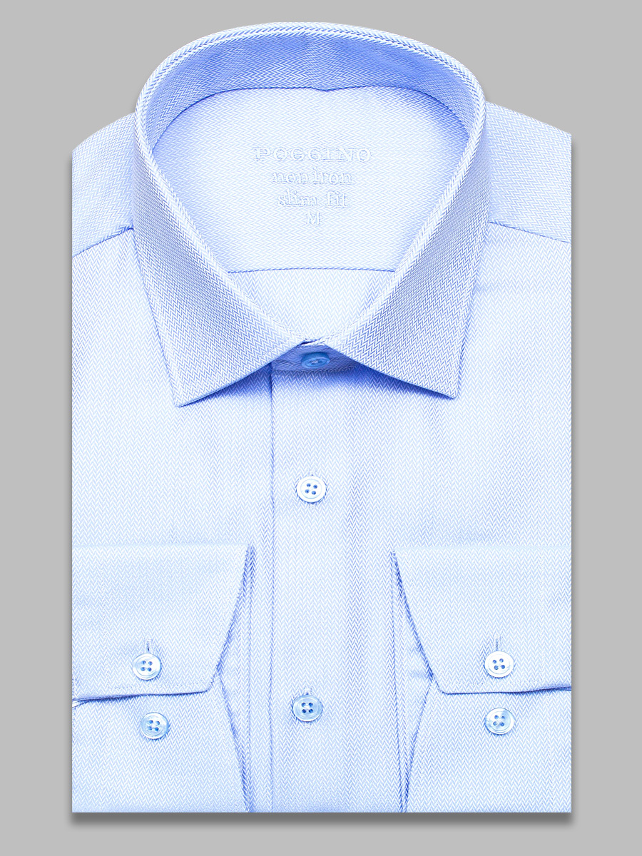 Приталенная мужская рубашка Poggino 8002-13 Non Iron голубого цвета с длинными рукавами и классическим воротником из натуральной 100% хлопковой ткани.