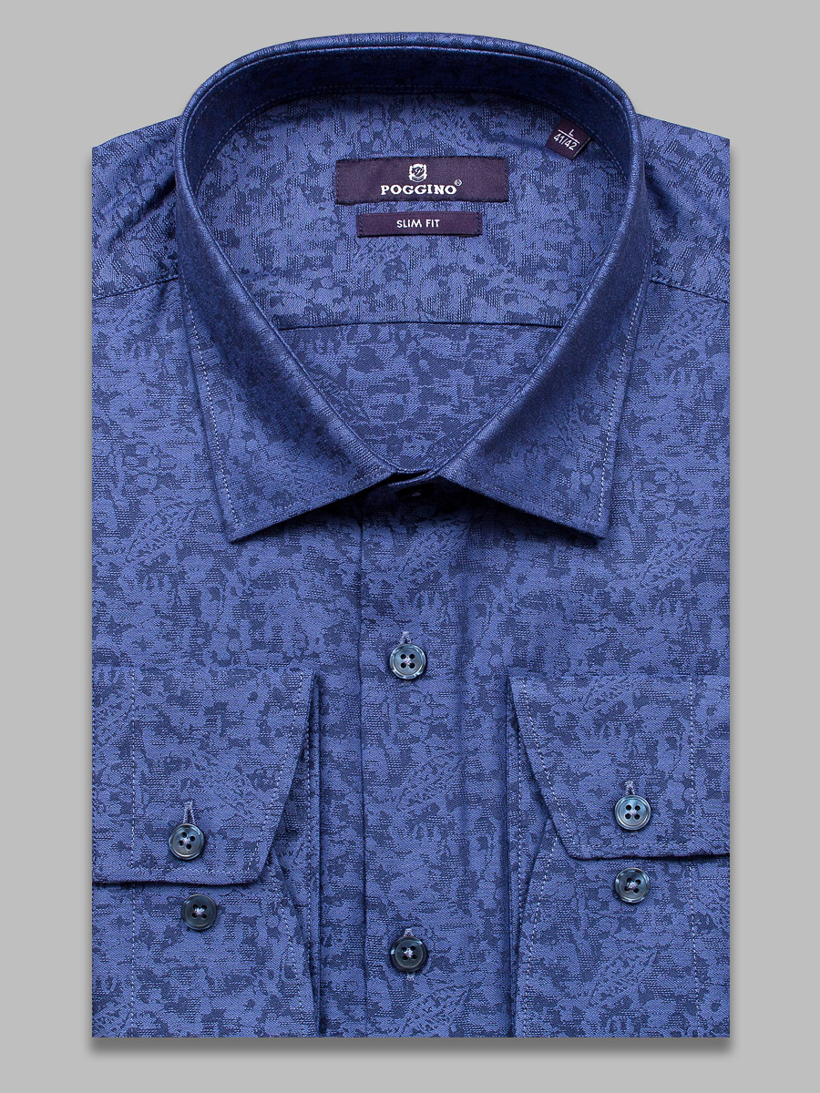 Приталенная мужская рубашка Poggino 7019-05 синего цвета с абстрактным принтом и длинными рукавами. Изготовлена из 100% хлопковой ткани, что обеспечивает комфорт и долговечность.