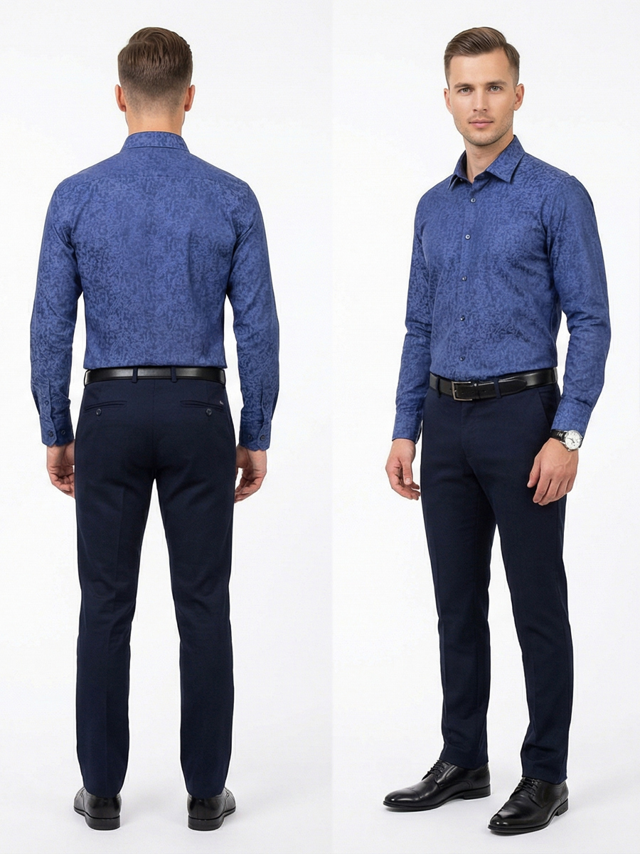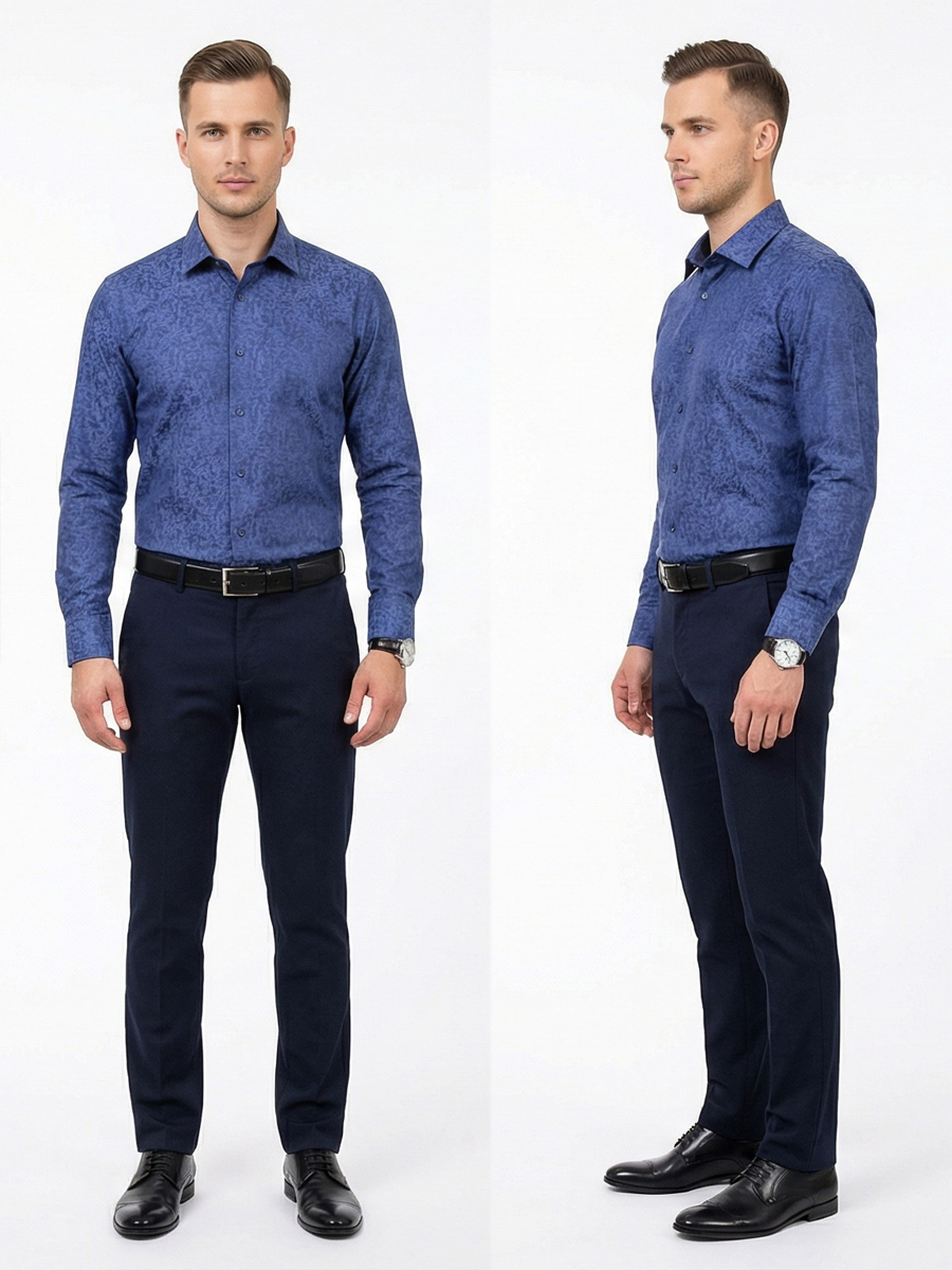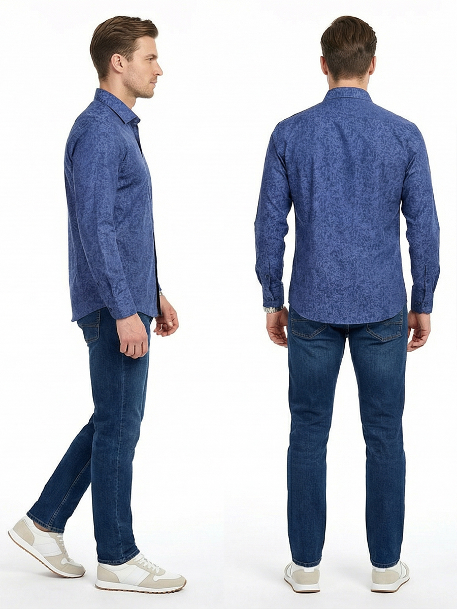 Синяя приталенная рубашка в абстракции с длинными рукавами