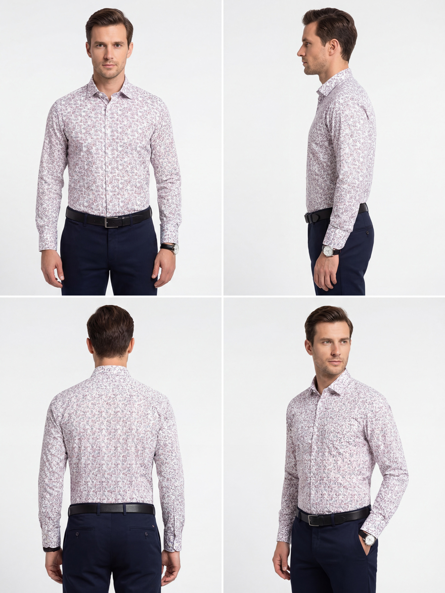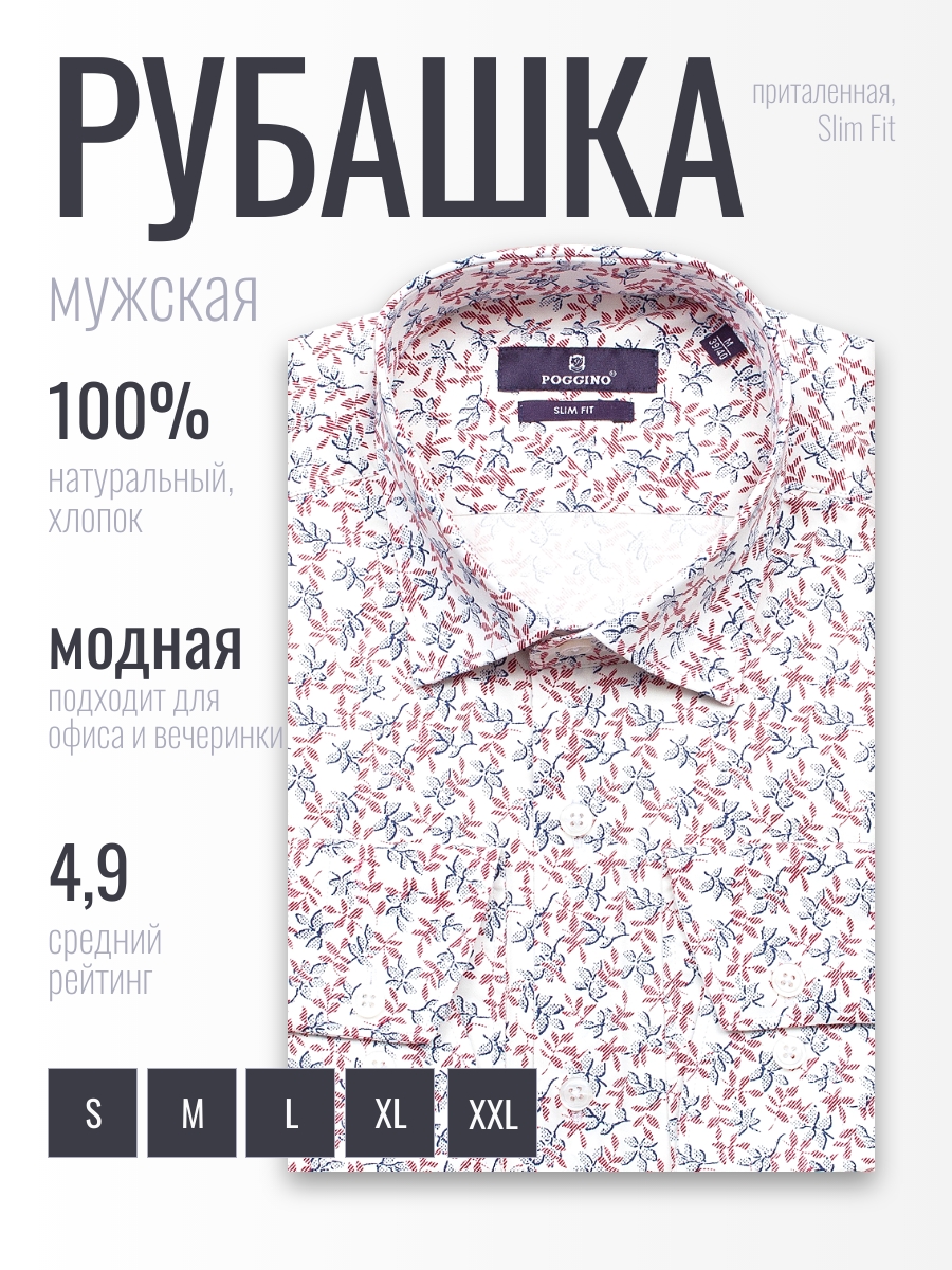 Приталенная мужская рубашка Poggino 7019-11 бордового цвета в листьях с длинным рукавом и классическим воротником из натуральной 100% хлопковой ткани.