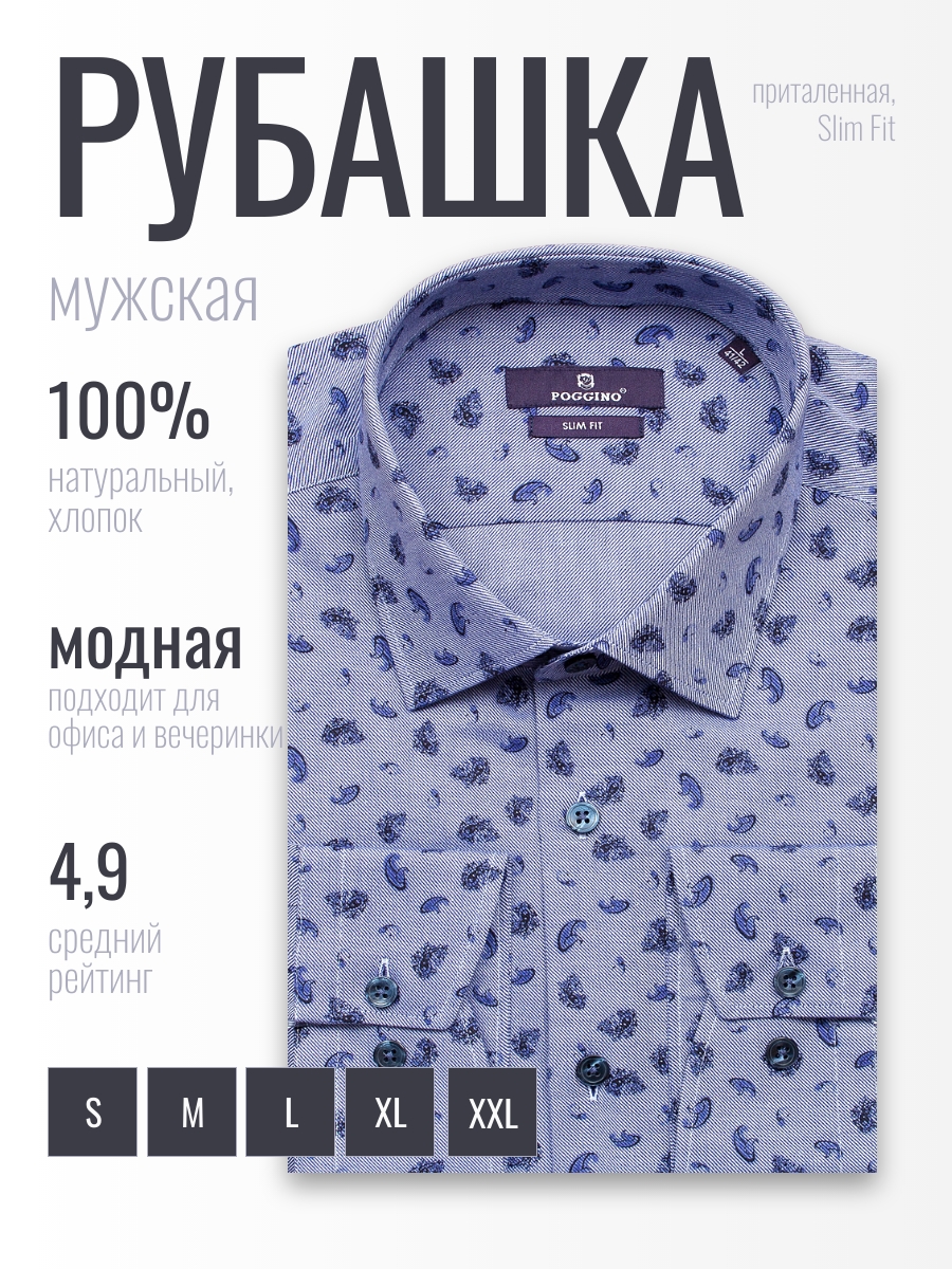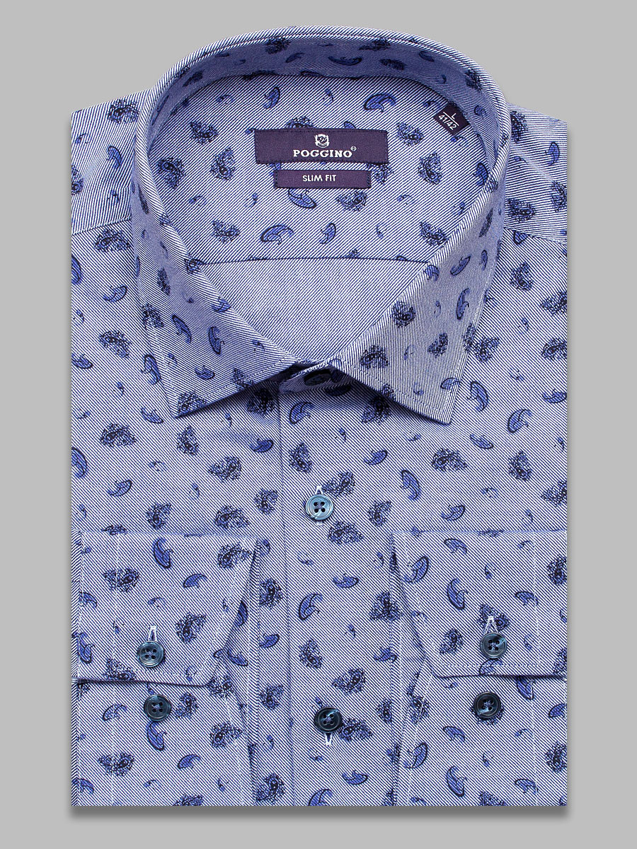 Приталенная мужская рубашка Poggino 7018-36 светло-синего цвета в огурцах с длинным рукавом и классическим воротником из натуральной 100% хлопковой ткани.
