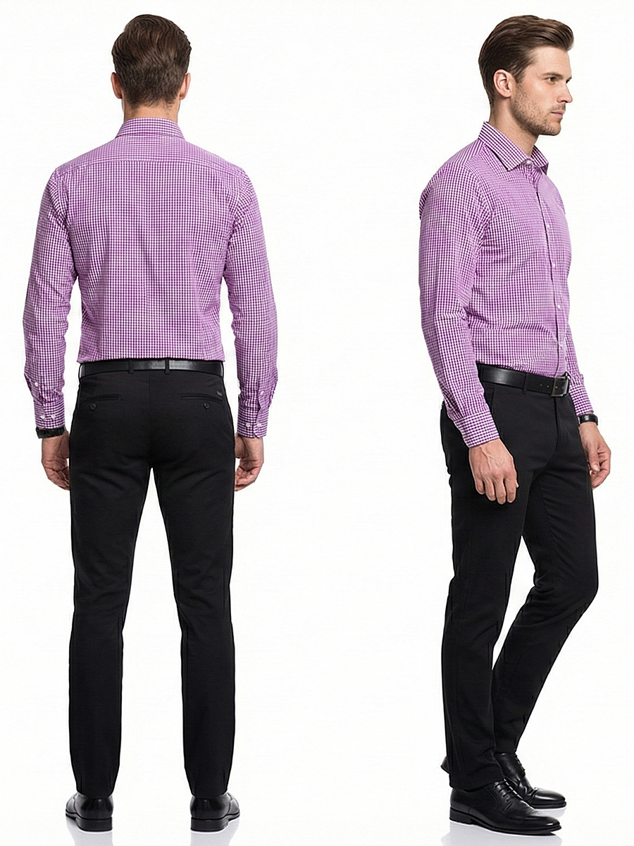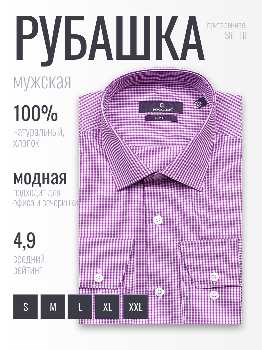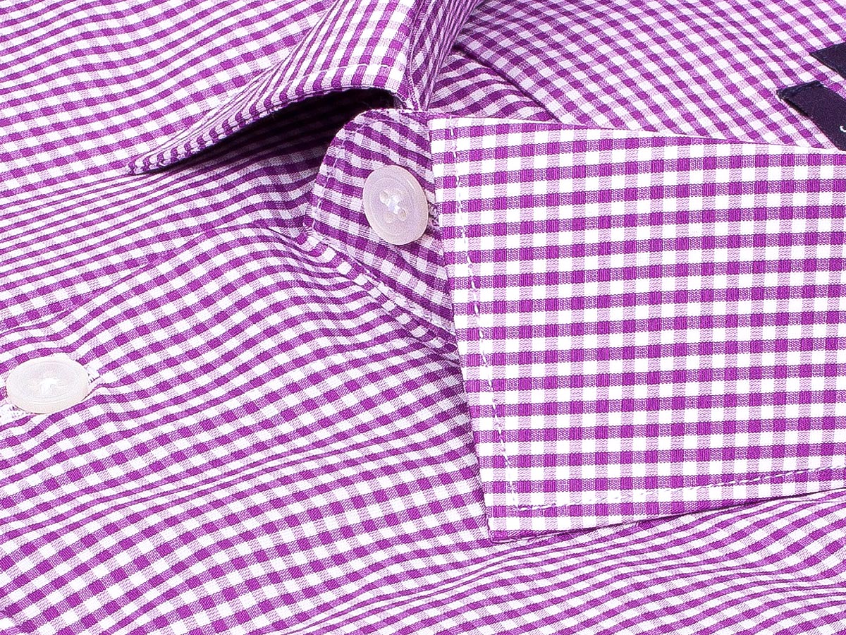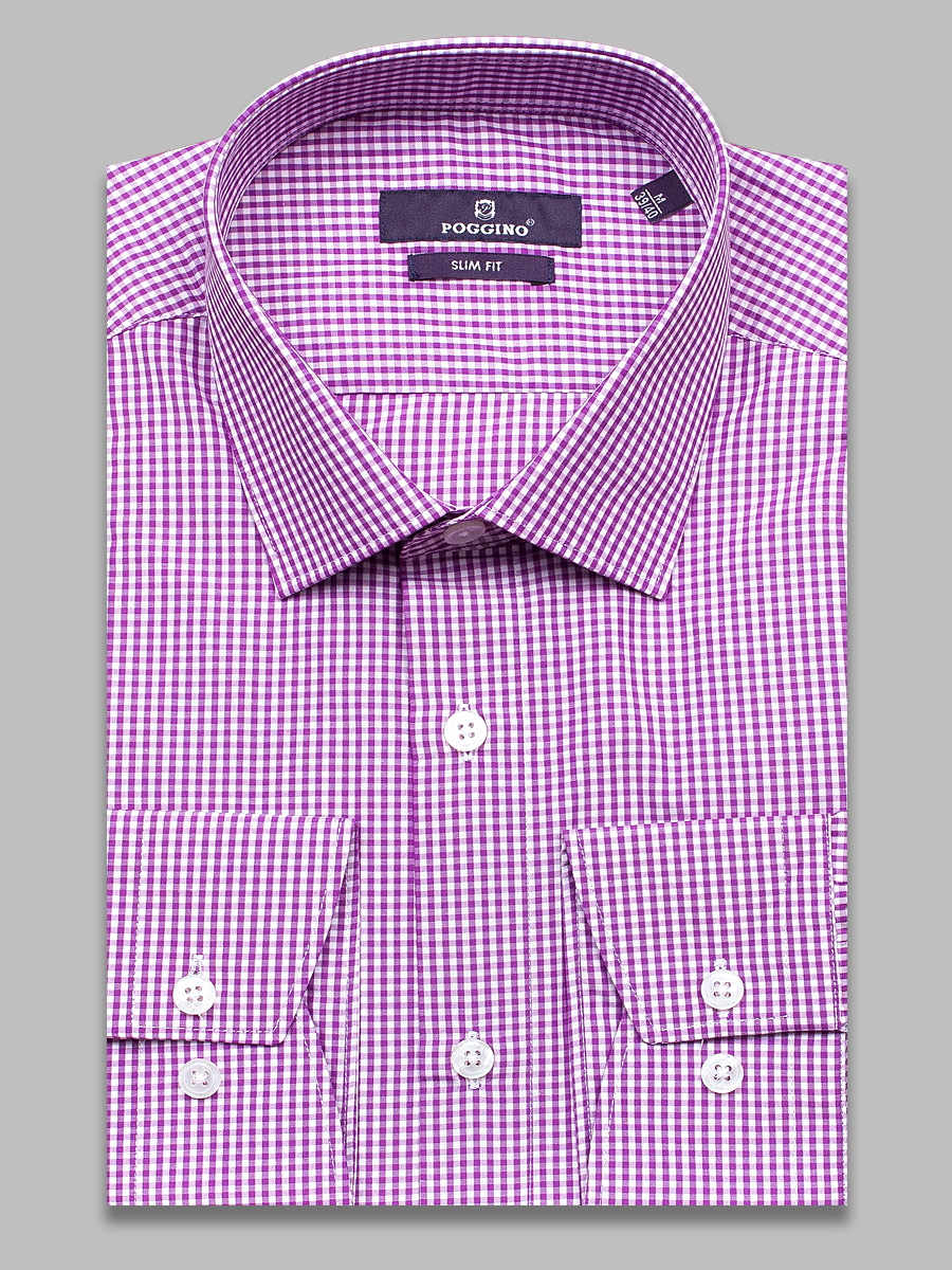 Приталенная мужская рубашка Poggino 7019-62 сиреневого цвета в клетку с длинными рукавами и классическим воротником из натуральной 100% хлопковой ткани.