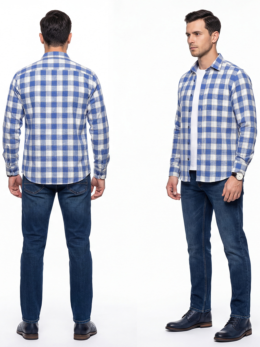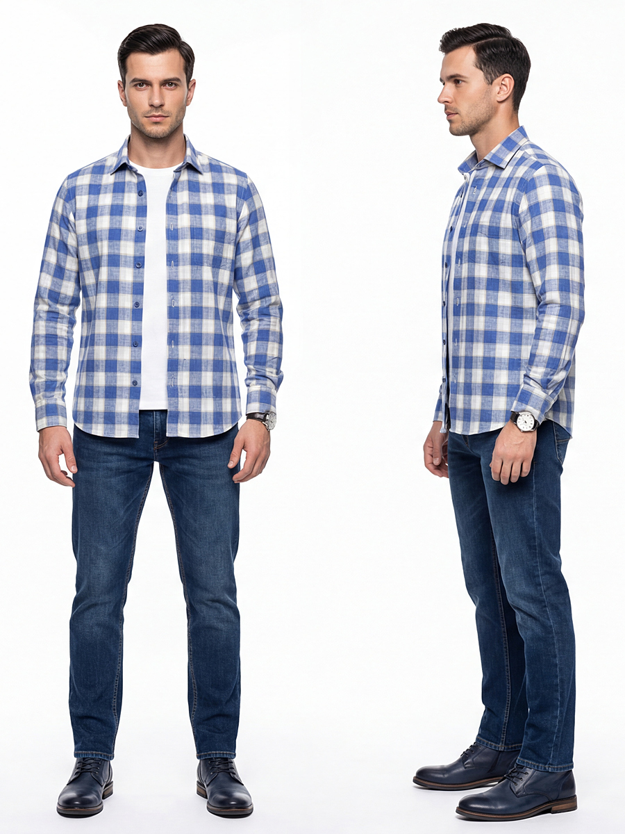 Байковая синяя мужская рубашка в клетку с длинными рукавами