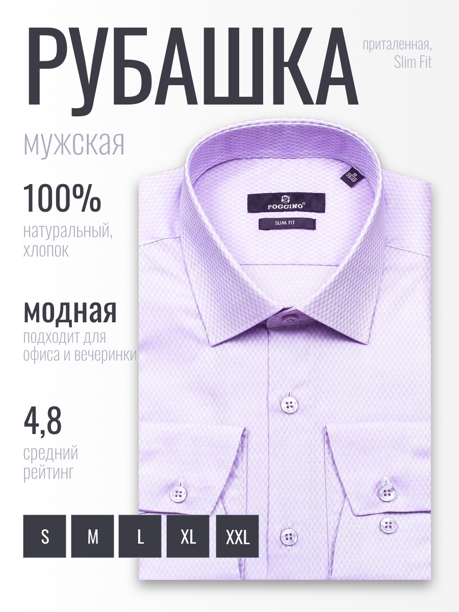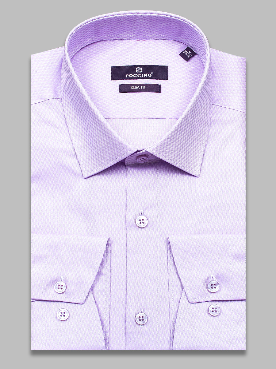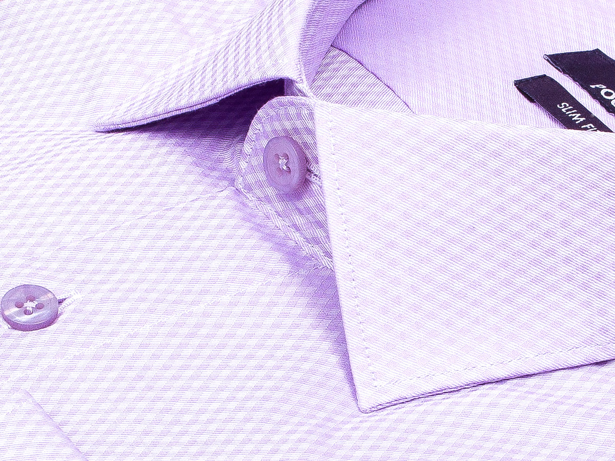 Приталенная мужская рубашка Poggino 7020-05 сиреневого цвета в клетку с длинными рукавами и классическим воротником из натуральной 100% хлопковой ткани.