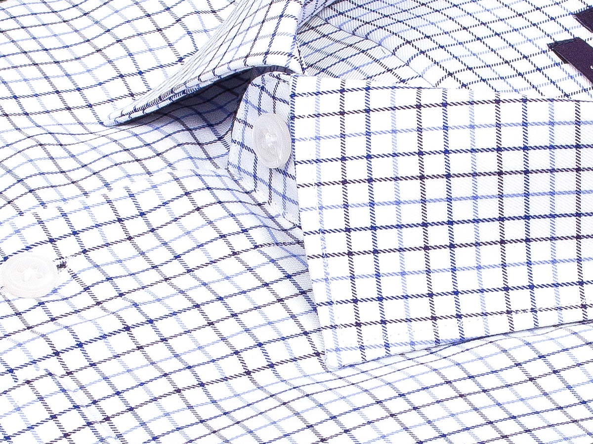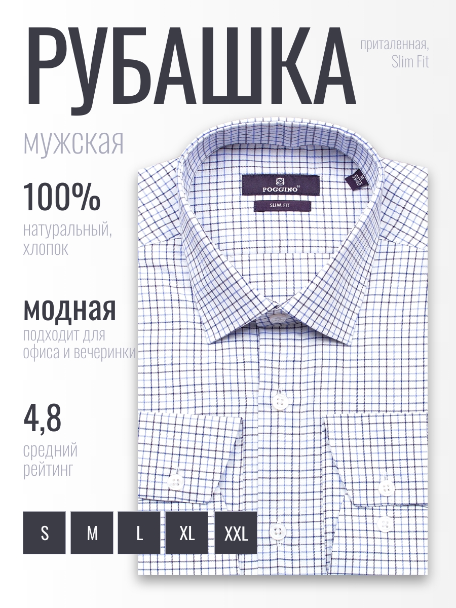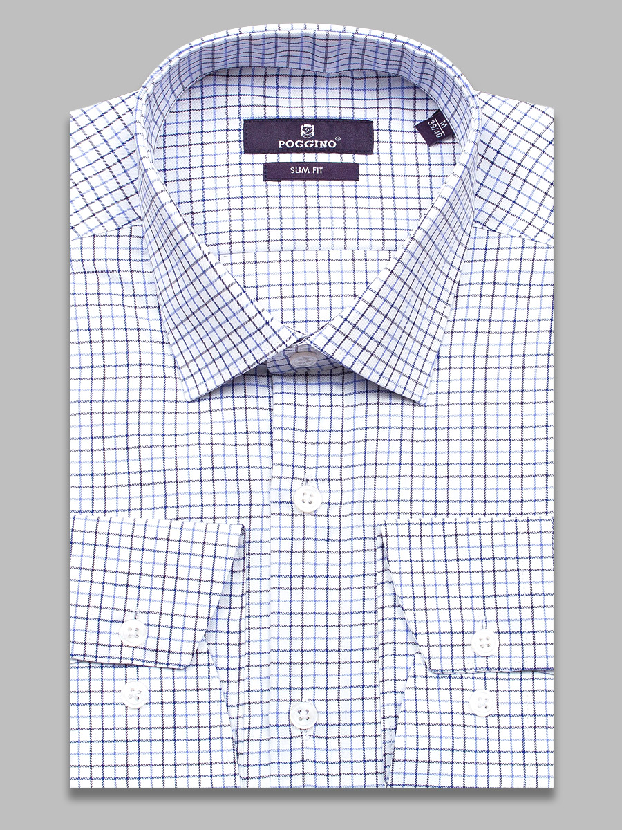 Приталенная мужская рубашка Poggino 7020-06 белого цвета в клетку с длинными рукавами и классическим воротником из натуральной 100% хлопковой ткани.